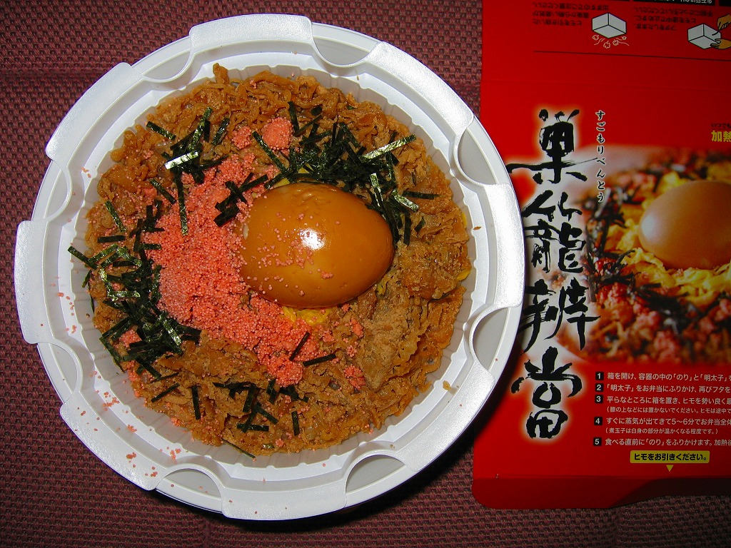 秋冬の駅弁大会シーズンに向けた、2009(平成21)年秋の新商品か。円形の加熱機能付き容器を使用、これを中身の美しい写真と調理手順を載せたボール紙の箱に詰めて、ラップでまるごと包む。中身は鶏炊込飯の上に鶏フレークを散らし、その中央に錦糸卵を敷いて明太子を周囲にまぶし、その上に煮玉子をひとつ載せるもの。