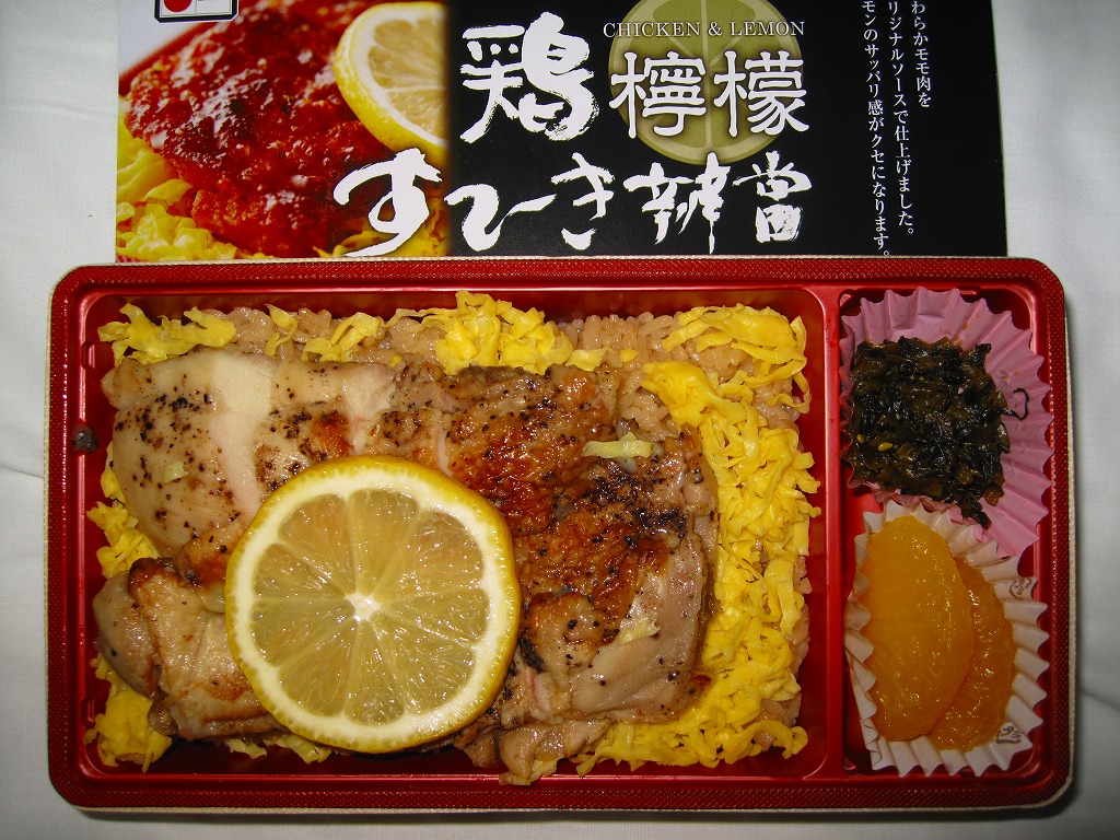 2009(平成21)年の秋に発売か。赤いトレーを接着した長方形の発泡材枠用意に透明なふたをして、中身の写真と商品名を美しく描いたボール紙の枠にはめ、ラップでまるごと包んで食品表示ラベルを貼る。中身は茶飯の上に錦糸卵を敷き、鶏レモンステーキなる、鶏もも肉をコショウで焼いてレモンの風味とスライスを付けたものが1個載せ、高菜炒めと甘夏みかんを添えるもの。