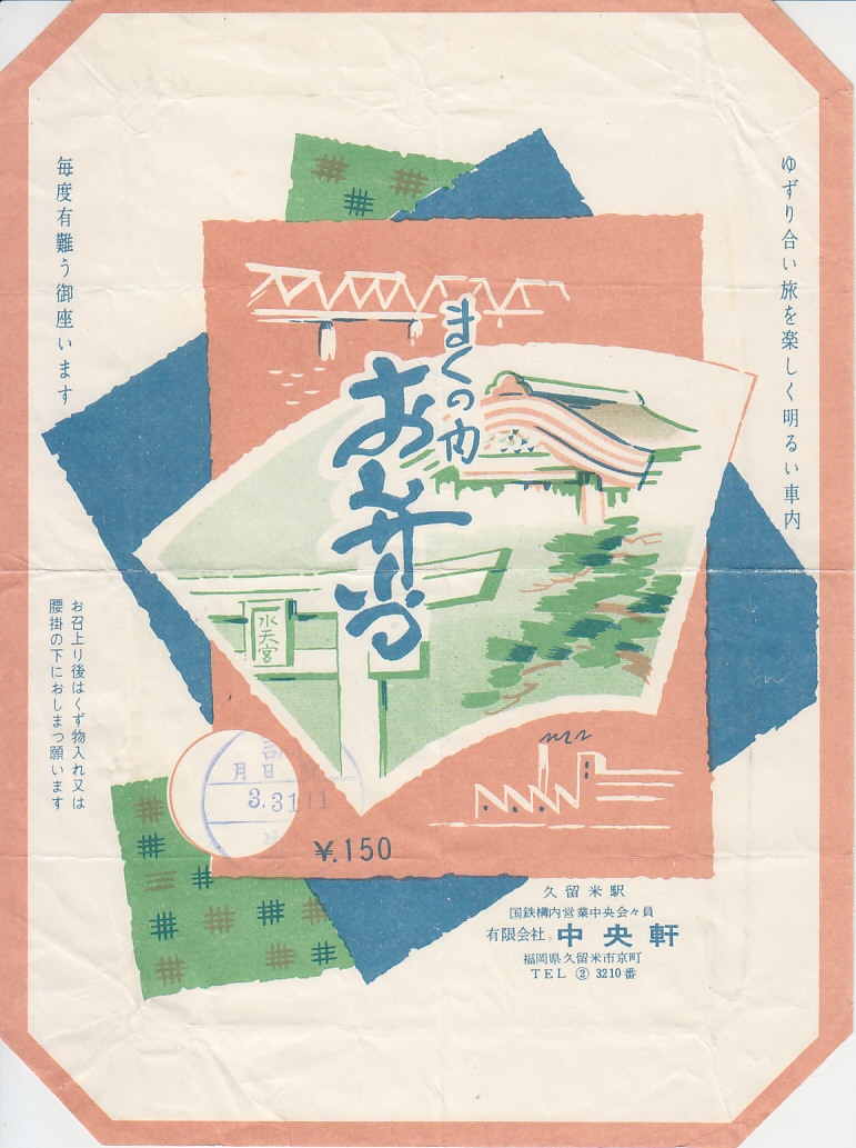 1960年代の、3月31日11時の調製と思われる、昔の久留米駅弁の掛紙。水天宮に鉄橋と工場という、当時の久留米に実在したものの絵柄。調製元の中央軒は鳥栖駅弁の中央軒と、1942年に合併し1950年に解散した間柄であり、のちに久留米中央軒を名乗ったうえで、2003年まで駅弁を販売した。