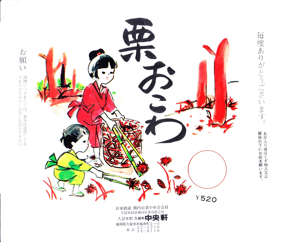 1990年代のものと思われる、昔の久留米駅弁の掛紙。八角形の容器に赤飯を詰め、栗を載せ、おかずを添える、小柄なお弁当だった。平成時代のものとは思えない栗拾いの絵を載せる。