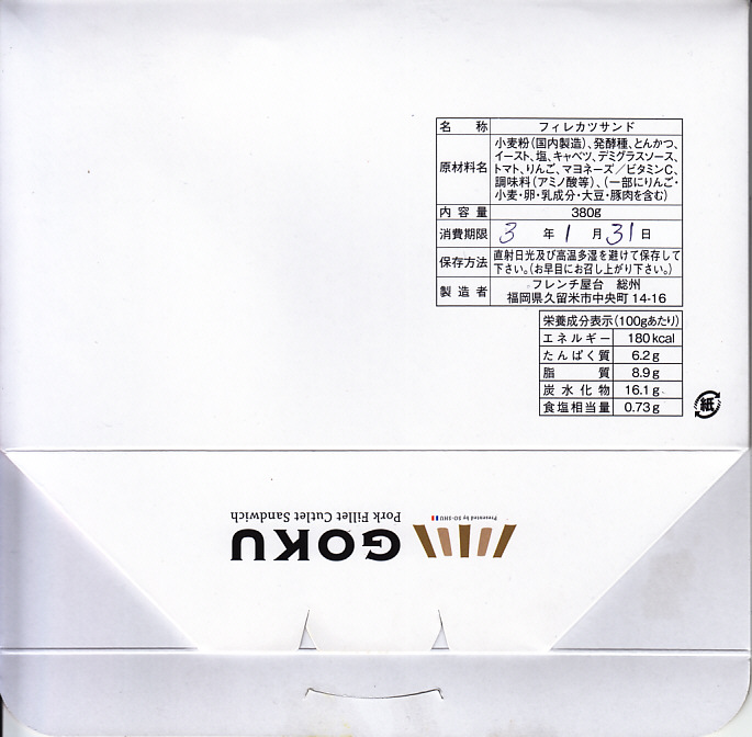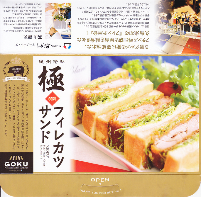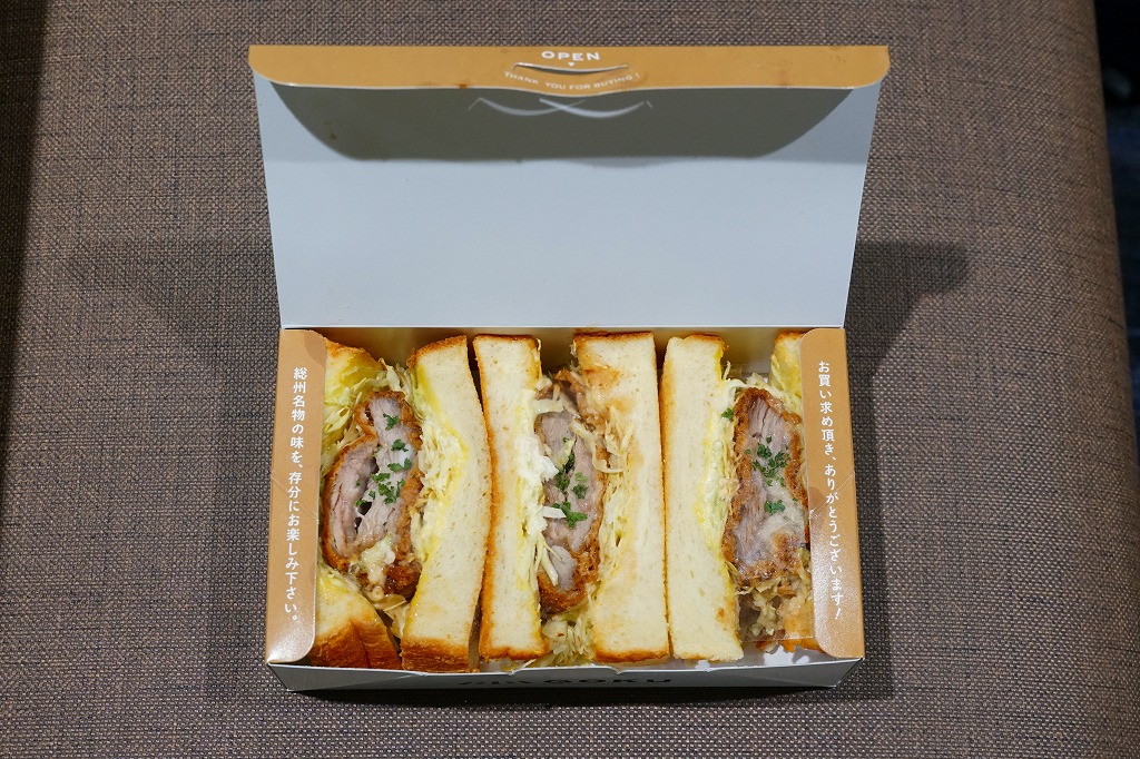 耳あり食パンのトーストに、丸いとんかつと千切りキャベツとソースとマヨネーズを挟んだカツサンドを3切れ、商品名と中身の写真が美しい専用の紙箱に直置きする。固さと厚さで食べにくいので、併売する紙箱でない1切れ物が便利そう。紙箱の「総州特製」「総州自慢」とは、千葉県の上総や下総を指す総州のことではなく、調製元の名前である。2022年の秋までに久留米駅の観光案内所では、これなど駅弁のようなものは売られなくなった模様。