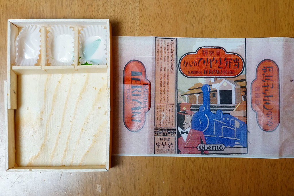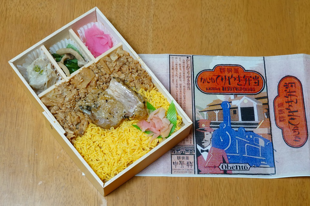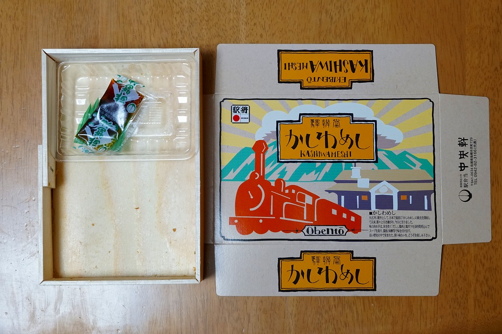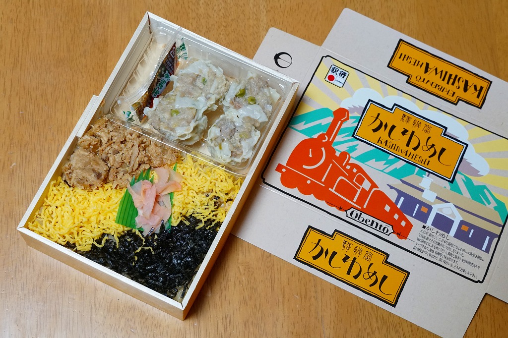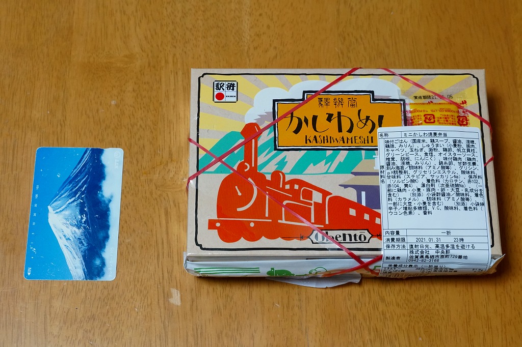 2011(平成23)年3月の九州新幹線鹿児島ルート全線開業に合わせて、久留米駅のコンビニで発売か。ふたの絵柄は、2駅先の鳥栖駅の駅弁「かしわめし」と同じ。ただし縦長の絵柄が横長に手直しされたうえ、こちらの中身はかしわめしというよりはむしろ焼麦(しゃおまい)弁当であり、店舗では「ミニかしわ焼麦弁当」の名で売られる。