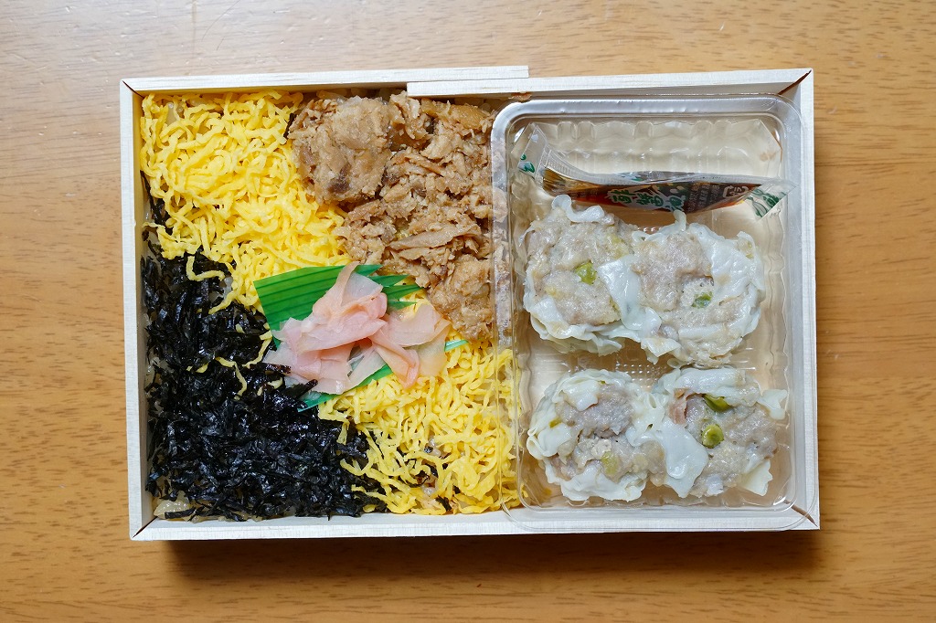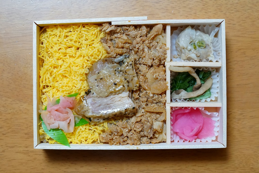 鶏スープで炊いた御飯を、鶏フレークと錦糸卵と刻み海苔のストライプで覆い、大根桜漬で彩り、しゅうまい4個と酢醤油を添える。鳥栖とはどこにも書いていないが、このしゅうまいは鳥栖駅で名物の焼麦(しゃおまい)であり、調製元は鳥栖駅の駅弁屋である。1食分の見栄えと内容を持つ、ハーフサイズの駅弁。2022年の秋までに久留米駅のコンビニでは、駅弁が売られなくなった模様。
