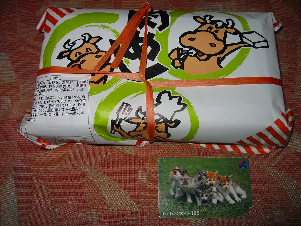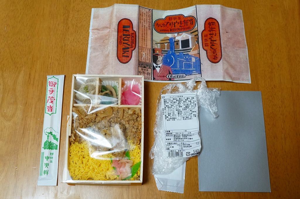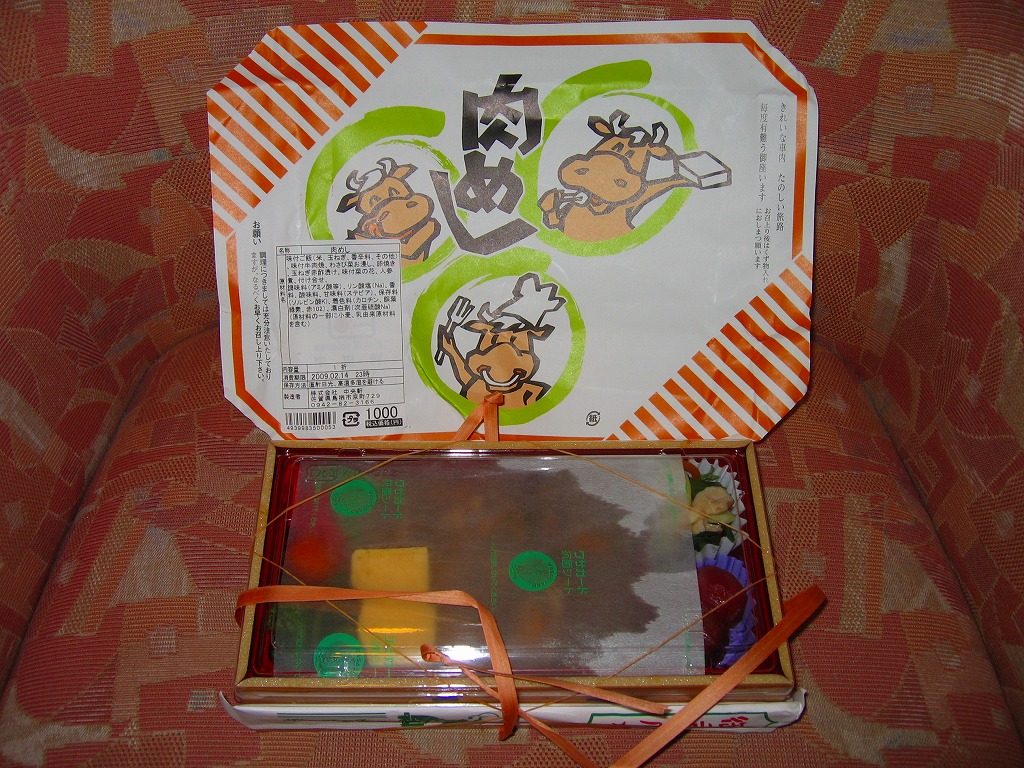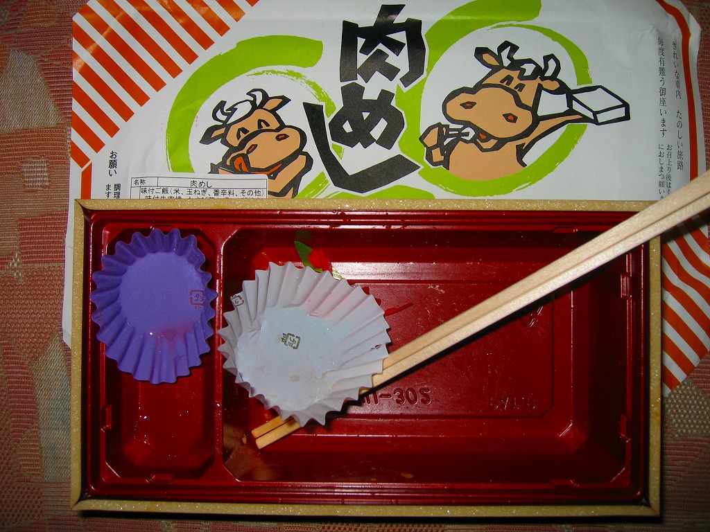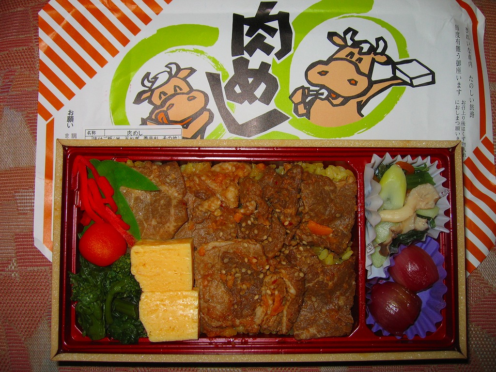 上記の駅弁「肉めし」を、2009(平成21)年に購入したもの。特徴的な容器や中身の雰囲気に加えて風味もだいぶ変わってしまい、価格もあり得ないくらい上がったが、本来は2003年の駅弁屋の廃業に伴い失われた駅弁であり、こうやって残存しただけでもありがたい。