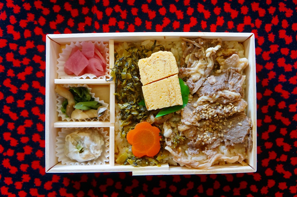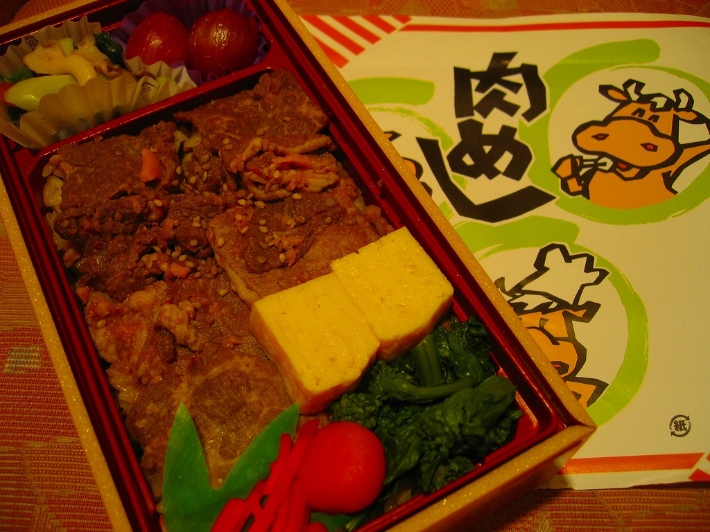 とても小柄な木の折り箱に、鶏スープで炊いた御飯を敷き、牛焼肉と高菜で覆い、玉子焼と花にんじんを置き、焼売、シメジと菜の花、大根漬を1区画ずつ添える。とはいえ、かつての「肉めし」を受け継いだのは掛紙の絵柄のみ。味も容器の形状も捨て、ただの牛肉と高菜の安っぽい弁当の味しかしなかった。2022年の秋までに久留米駅のコンビニでは、駅弁が売られなくなった模様。