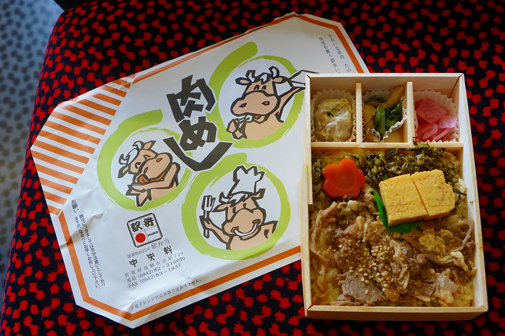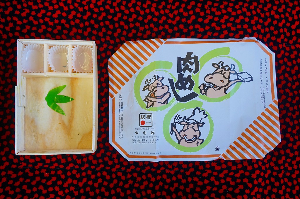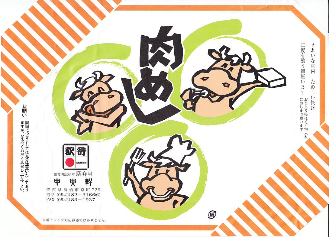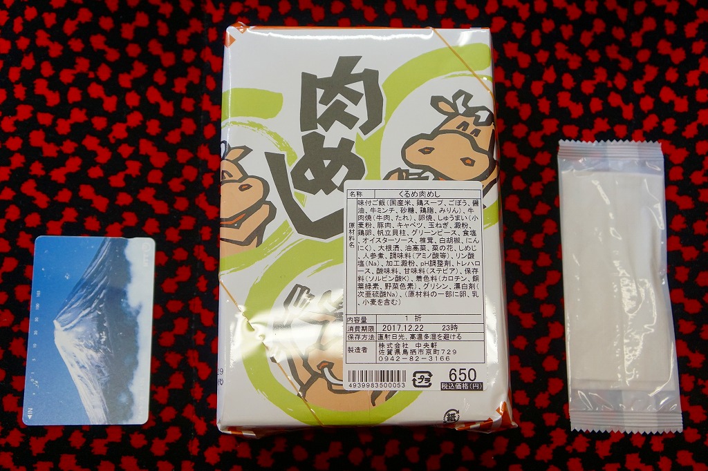 「肉めし」は、1965(昭和40)年頃から久留米駅で売られた名物駅弁。2003(平成15)年11月限りで失われ、その後に合併先の鳥栖駅の駅弁屋が売り、久留米駅から売店が消えてなくなり、2011(平成23)年3月の九州新幹線開業で駅のコンビニに復活し、時期不詳でまた消えてなくなり、今回の訪問で再度復活していたもの。