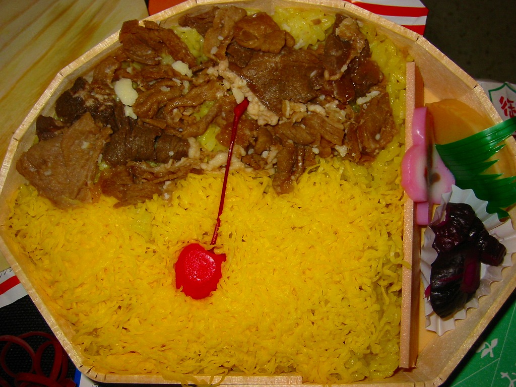 1965(昭和40)年頃に発売。扇形でも楕円形でもない独特な形の容器を使用、牛肉スープとカレー粉で炊いた味付御飯の上に、錦糸卵と牛肉を半分ずつ敷き詰め、さくらんぼでアクセント。御飯・錦糸卵・肉それぞれを個別に食べるとお世辞にも美味くないが、まとめて口に含むと不思議な旨味がにじみ出てくる。駅弁屋の社長が阿蘇旅行で思い付いたのだとか。