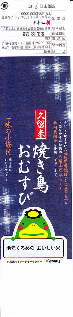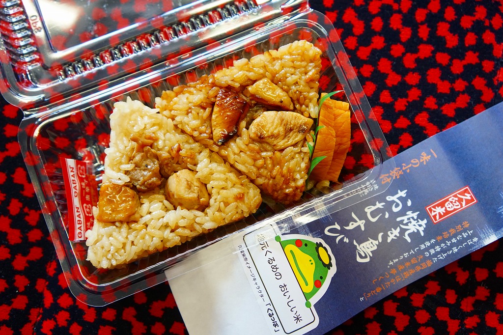 2010(平成22)年4月3日のJR久留米駅の新駅舎オープンで開業した、久留米市観光案内所に併設の売店「地場産くるめ」で発売。この店のみの限定販売という。福岡県産の地鶏「はかた一番どり」の焼き鳥3個を埋め込んだ、かっちり正三角形の型押し茶飯をふたつ、たくあんと唐辛子を添えて透明なプラ製の惣菜容器に詰め、商品名と宣伝文を書いた紙帯で留める。その姿はまるでミニ駅弁。この内容と値段の範囲で、冷たくてもおいしい感じの商品。調製元は久留米市内の弁当屋。調製元の廃業により、2021年3月限りで終売。
