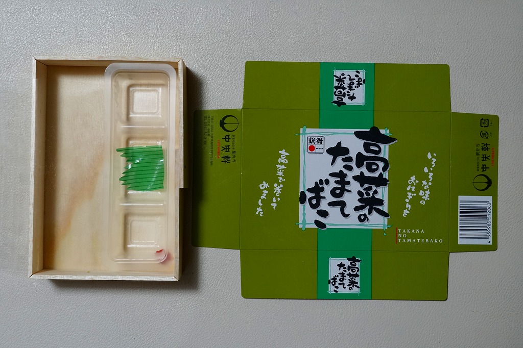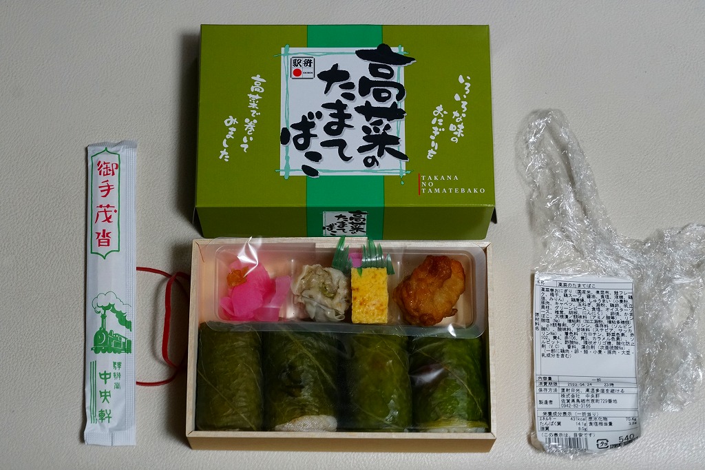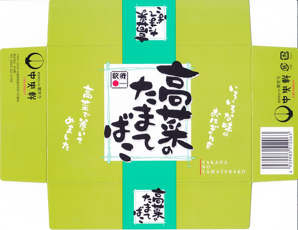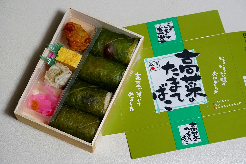 2011(平成23)年3月の九州新幹線鹿児島ルート全線開業に合わせて、久留米駅のコンビニで発売か。高菜色のボール紙に商品名を記したふたをかける、小さな長方形の容器に、鶏飯を高菜で巻いた俵飯を4個も並べ、鶏唐揚、玉子焼、かまぼこ、しゅうまい、大根桜漬を添える、おにぎり弁当。九州では炒めるか漬けて刻まれ食べられる高菜が、ここでは九州でなく紀州のめはりずしのように、あるいは大分県日田の郷土料理とも紹介される巻き物として使われる。価格は2011年の発売時で525円、2014年時点で540円。2022年の秋までに久留米駅のコンビニでは、駅弁が売られなくなった模様。