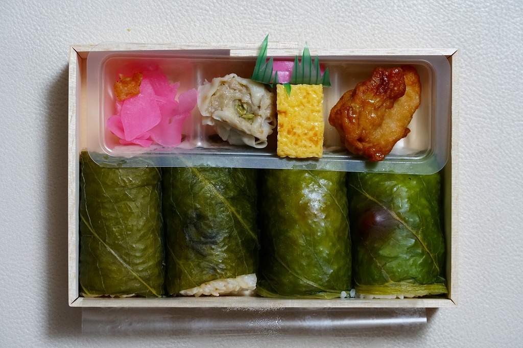 2001(平成13)年に発売か。特急列車「ゆふいんの森」の車内販売専用弁当として開発された。赤い花柄和紙を貼った美しい長方形ボール紙容器に掛紙をかけて深緑色の紙ひもでしばる。中身は12分割され、ちらしずし・山菜飯・茶飯で御飯が3区画、チキンのハーブ焼やバジル添え野菜マリネやレモングラス味付ウインナーなど、ハーブをふんだんに使ったおかずが7区画、デザートにハーブ寒天のフルーツポンチが1区画、漬物に1区画。知名度が意外にないが、実際に食べた人の多くが絶賛しているようだ。