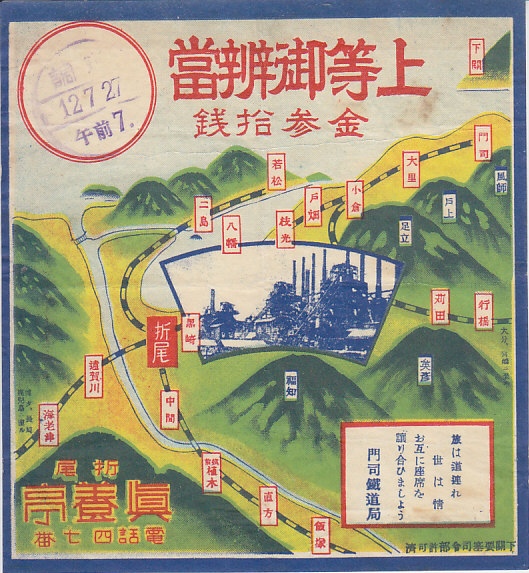 1937(昭和12)年7月27日7時の調製と思われる、昔の折尾駅弁の掛紙。この構図での鉄道路線図の掲載は、この調製元の後進による現在の折尾駅弁「かしわめし」と似ていて興味深い。中央の工場写真は八幡製鉄所の熔鉱炉であり、同じ構図で戦前に絵葉書が発行されている。