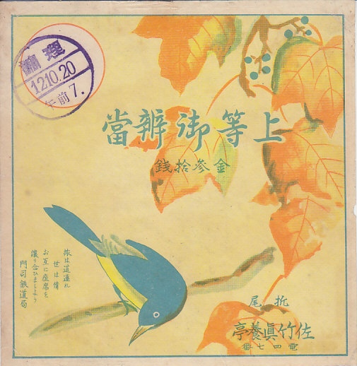 1937(昭和12)年10月20日7時の調製と思われる、昔の折尾駅弁の掛紙。特に折尾や九州を示したのではないと思う、葉と鳥の構図。