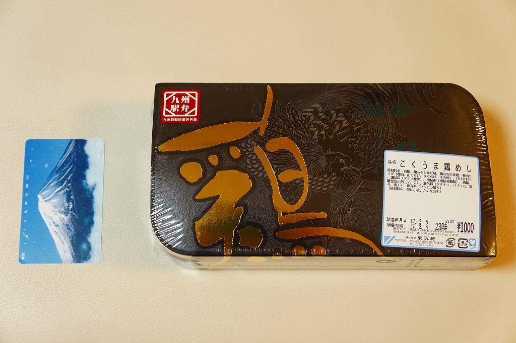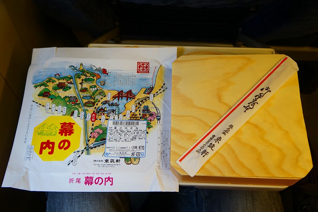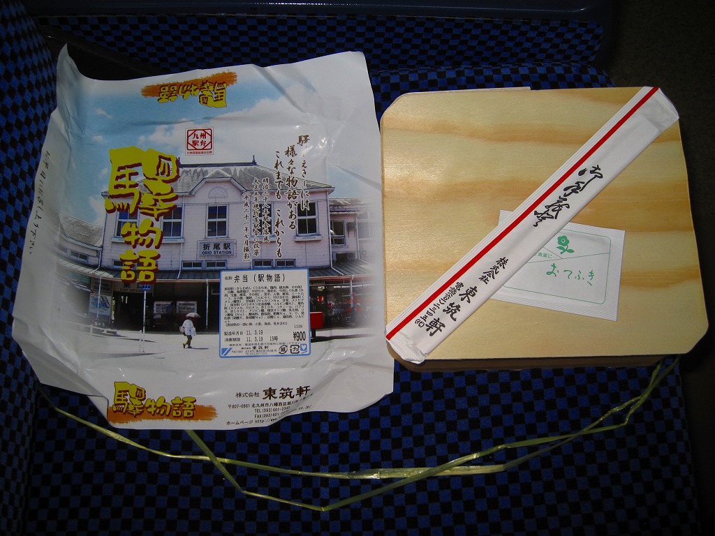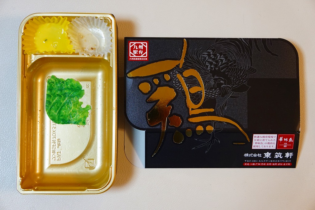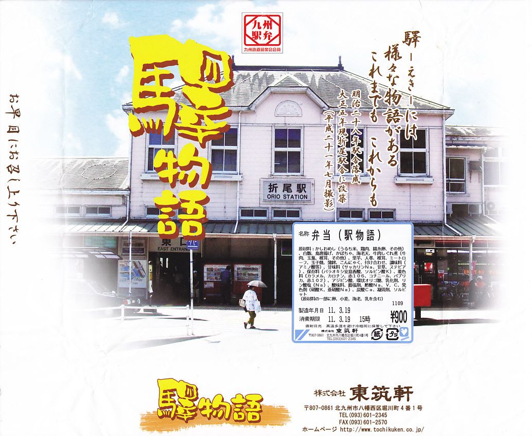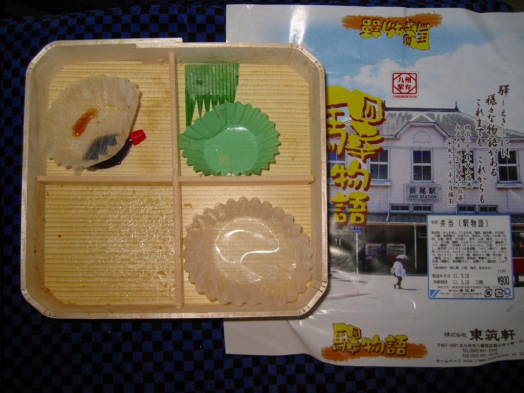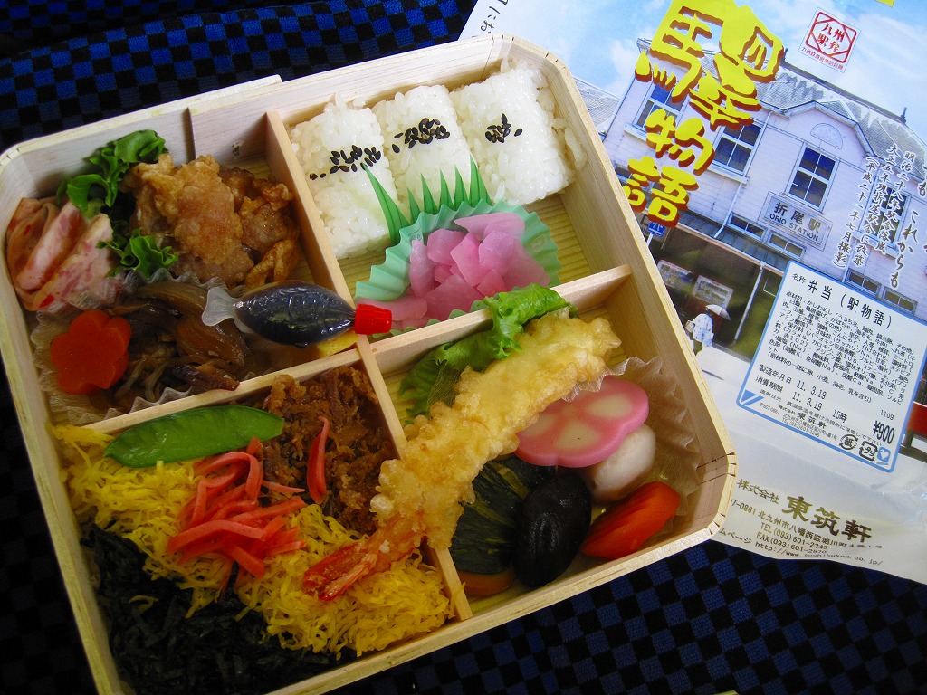 JR九州の駅弁キャンペーン「第6回九州の駅弁ランキング」の実施に合わせて、2009(平成21)年10月に発売。平たく四角い木製容器に経木でふたをして、折尾駅舎の写真を載せた掛紙で包む。中身はかしわめし、白御飯と桜漬、鶏唐揚とミートローフと牛肉しぐれ煮、カボチャやシイタケなどの煮物とエビフライで4区画。上等幕の内駅弁のような価格と容器と内容を持つものの、おかずの味は並等幕の内駅弁のレベルに思えた。
