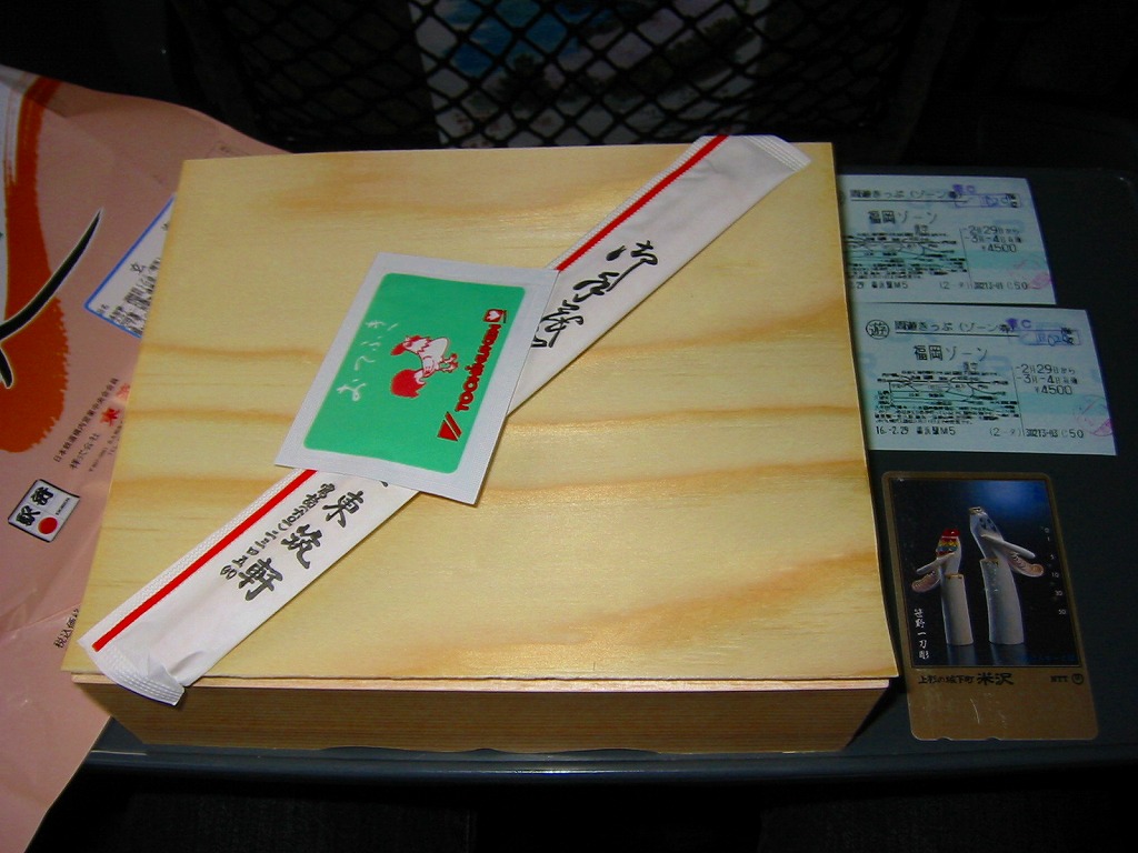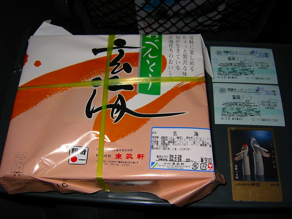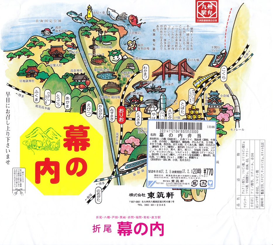 折尾駅の幕の内弁当。枠とふたが経木の長方形の容器を大きな掛紙で包み、スズランテープでしばる。中身はご飯が九州型か梅花型の日の丸御飯に紅生姜などの巻物三個、おかずが焼き魚(マス)、蒲鉾、玉子焼に帆立や有頭海老、鶏唐揚げとウインナーなど。「かしわめし」のついでに片手間で一応幕の内駅弁も用意した、ということはないと思うが、体裁や内容になんとなく貫禄ある余裕を感じる。2006年頃に終売か。