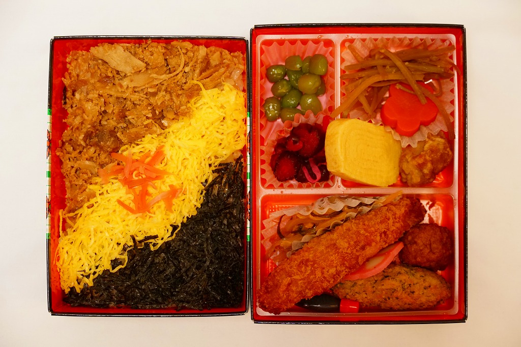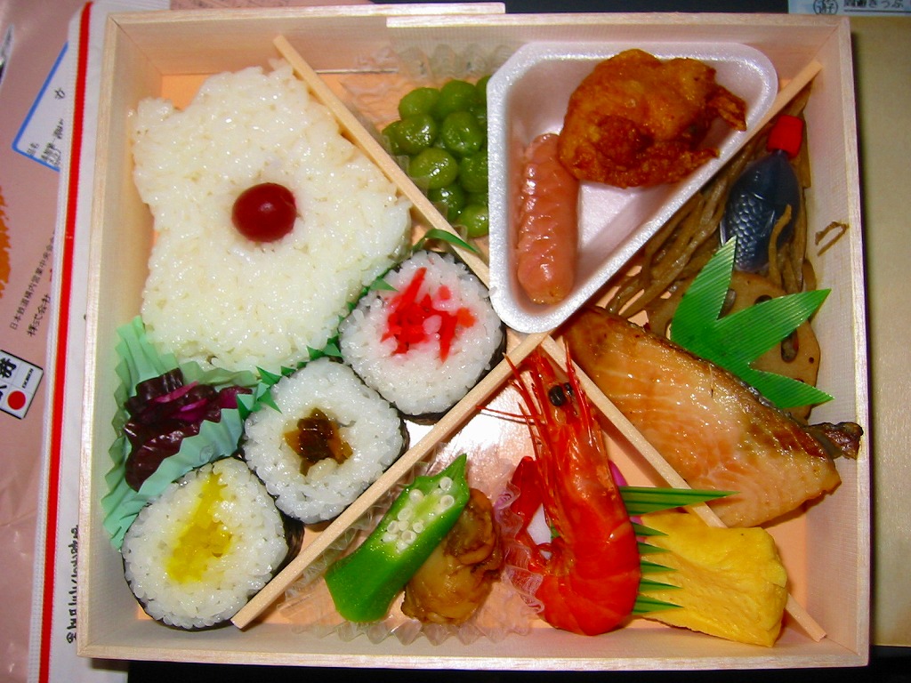 折尾駅の幕の内駅弁。実在する駅弁であるが、売店で見られるのは稀であり、今では調製元のチラシに要予約と書かれる。掛紙の絵柄と容器は、折尾駅の名物駅弁「かしわめし」と共通。内容は日の丸俵飯に白身魚フライ、筑前煮、鶏唐揚、サバ塩焼、がんもどき、玉子焼、きゅうり漬、巻き昆布、切り干し大根、たくあん漬、かまぼこなど。昭和時代の幕の内駅弁の、定番のスタイル。価格は2017年の購入時で770円、2020年時点で800円、2022年3月から850円、9月から880円、2023年9月から920円、2024年9月から970円。2025年3月1日限りで販売終了。