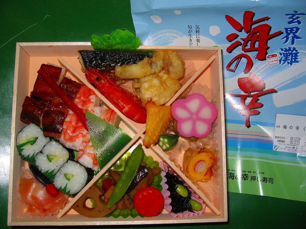 2005(平成17)年の秋に発売。予約により販売。大きな長方形の経木枠の容器に薄板のふたをして、割りばしとおしぼりを添えて駅弁の名前を書いた掛紙で包み、ビニールひもでしばる。中身は穴子寿司と海老寿司とかっぱ巻、鯖塩焼に有頭海老にイカ天ぷらに蒲鉾や煮物など。