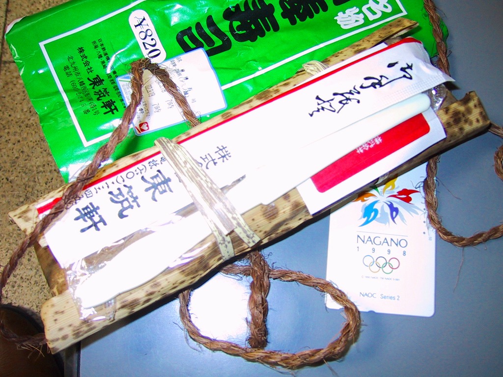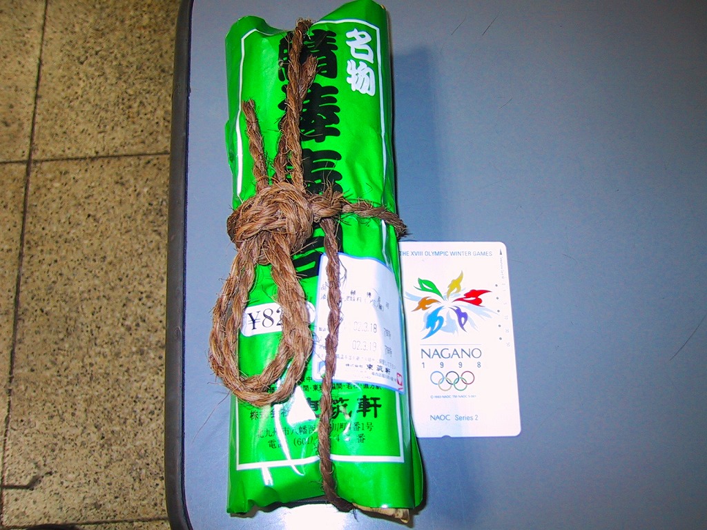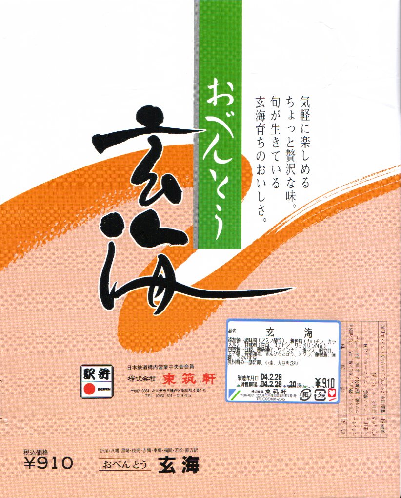2002(平成14)年3月18日に購入した、折尾駅弁の掛紙。上記の2005年のものと同じ。容器は同じ、中身も雰囲気は変わらない。
