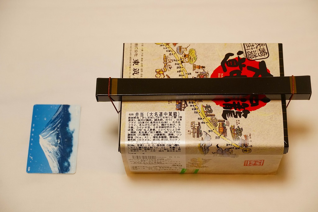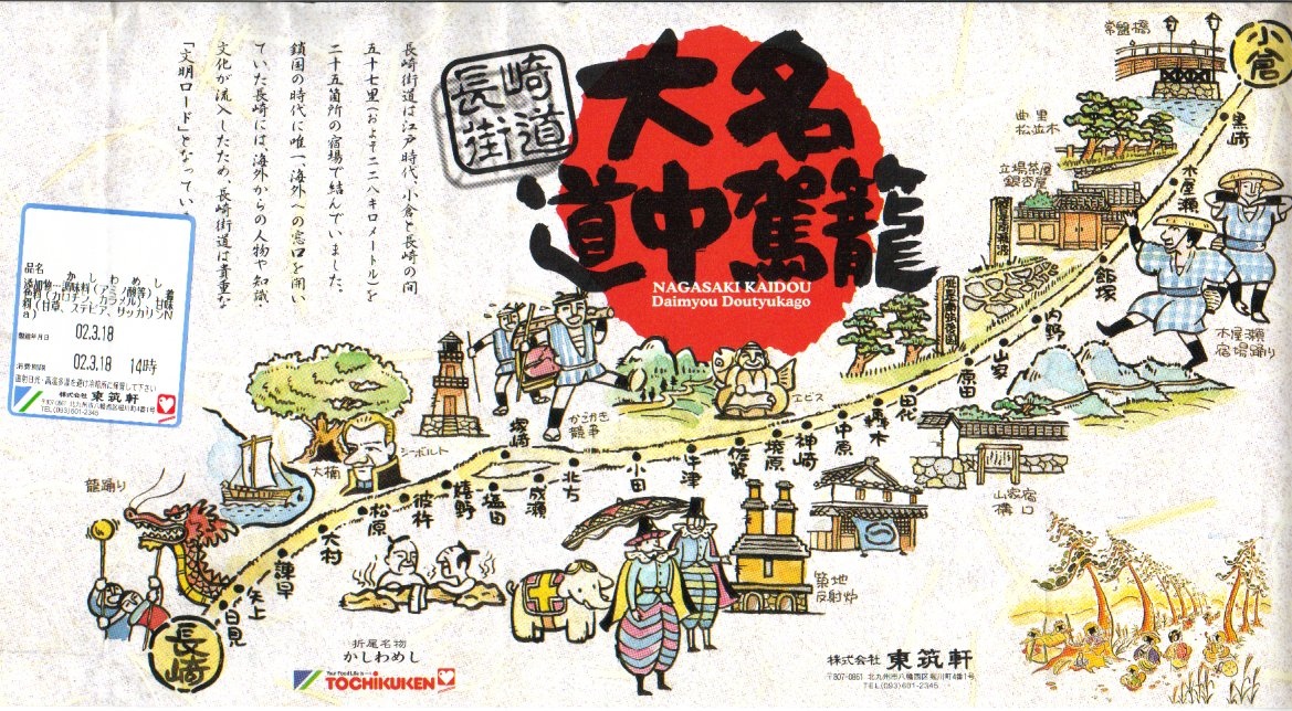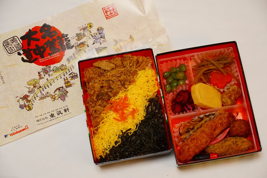 駅弁の名前は「大名道中駕籠かしわ」とも。北九州市八幡西区の長崎街道まちづくりサミットの開催の一環で、1996(平成8)年9月7日に発売。小倉と長崎を結んだ長崎街道をコンセプトにした駅弁。厚紙の黒い小箱を重ね、長崎街道のイラストマップで包み、割りばしを収める担ぎ棒を載せてゴムでしばり、駕籠のような形にした。この容器は市販品のようで、他駅の駅弁でも時々見掛ける。