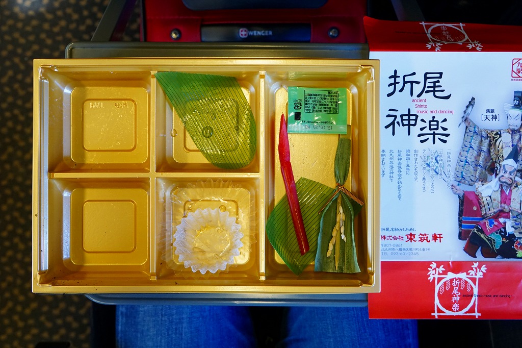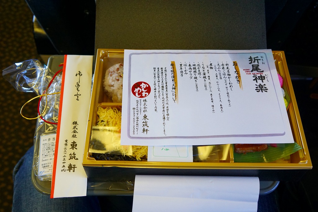 JR九州の駅弁キャンペーン「第10回九州の駅弁ランキング」の実施に合わせて、2013(平成25)年10月に発売。掛紙に描かれ、駅弁の名前にもなった折尾神楽は、1970(昭和45)年の大阪万博で人気になった島根県の石見神楽をモデルに、同年から北九州市内で行われ始めた神社での舞楽。大きなおしながきにも書かれる中身は、かしわめし、赤米ごはん、エビやオオバなどの天ぷら、タケノコやサトイモなどの煮物、うなぎ蒲焼き、花かまぼこ、地鶏照り焼き、春雨サラダ、はじかみ、豊年団子と盛りだくさん。駅弁の賞は獲れなかったが、この駅弁は2019年2月まで予約により販売された。価格は2013年の発売時で1,260円、後に1,130円または1,300円。