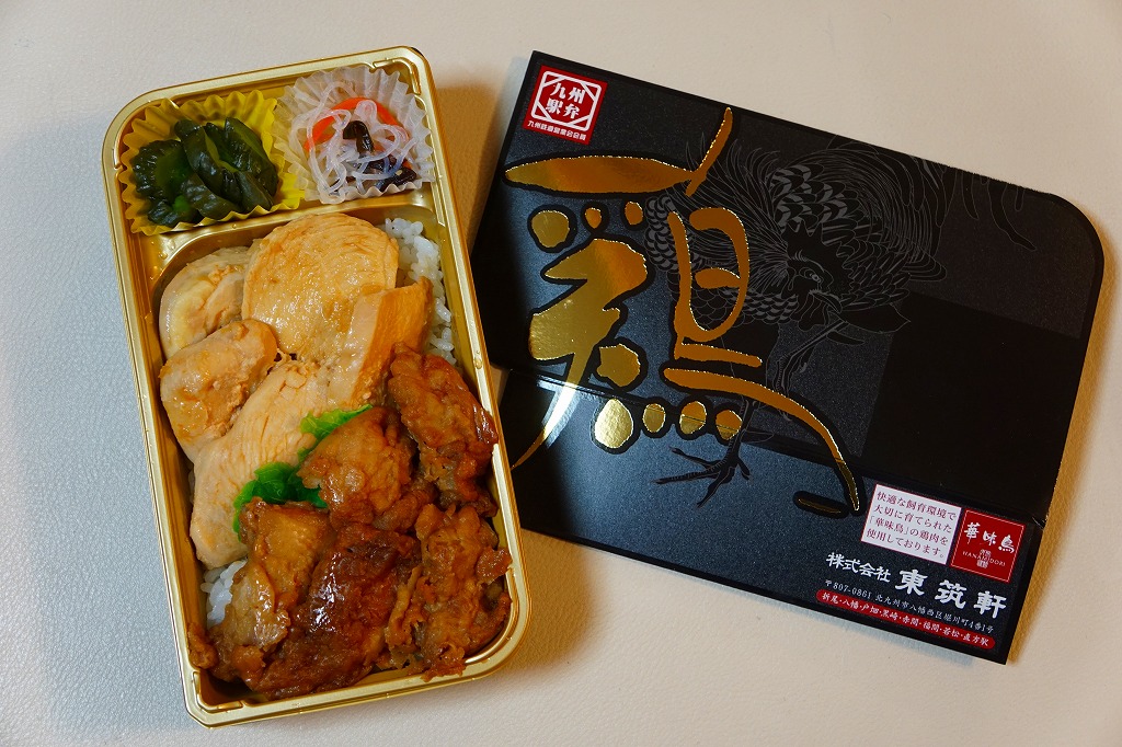 折尾駅の「かしわめし」でない鶏飯駅弁。肉が細かく奥深い風味を持つ伝統のかしわめしとはだいぶ異なる、見た目も味も食感も大振りで力強くストレートな鶏肉の弁当で、折尾駅の駅弁としては目新しさを感じた。2017(平成29)年9月1日にリニューアルのうえ1,080円で再発売、2019(平成31)年2月限りで終売。