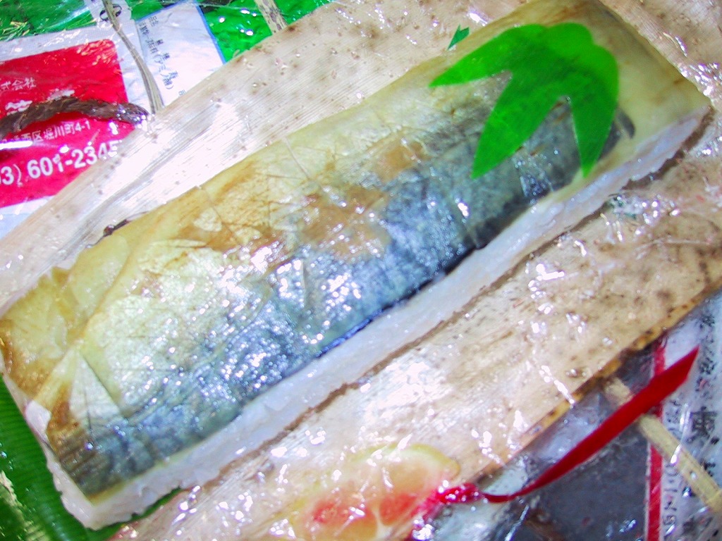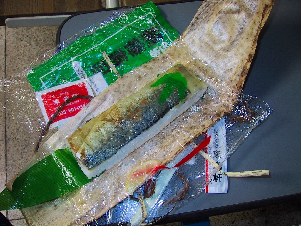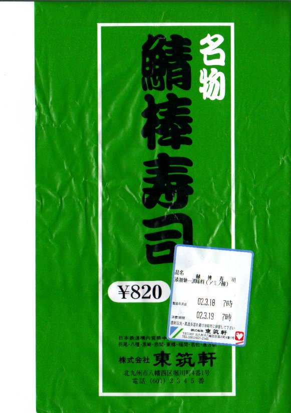 1987(昭和62)年の発売。またはJR九州の駅弁日本一キャンペーンの一環として、1988(昭和63)年6月に発売か。「かしわめし」の折尾駅にも、このような駅弁もある。駅弁の名前そのままのサバの棒寿司を、一口サイズに切れ目を入れ、ラップに包んで竹の皮でくるみ、箸とナイフと手拭きを一緒に針金で巻いて掛紙をかけ、ごついひもでしばる。価格は2002年の購入時で820円、2004年4月1日から840円、2007年10月現在で900円、2014年4月の消費税率改定で930円。2019年3月1日限りで終売。