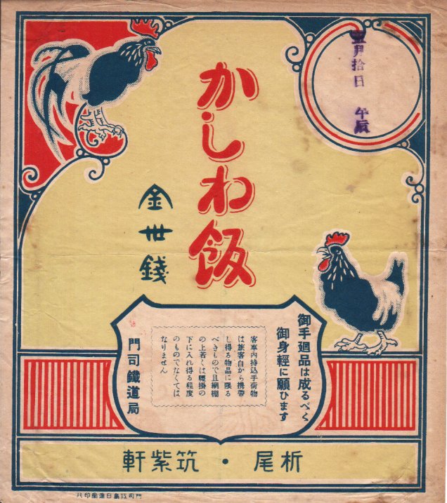 1938(昭和13)年4月24日6時の調製と思われる、昔の折尾駅弁の掛紙。4月18日から24日までの観光報国週間の駅弁掛紙として、各駅各社共通で使われた絵柄だろうか。調製元の筑紫軒は1942年の4社合併でできた東筑軒の前身のひとつで、この「かしわめし」が今も折尾駅で名物として売られる。