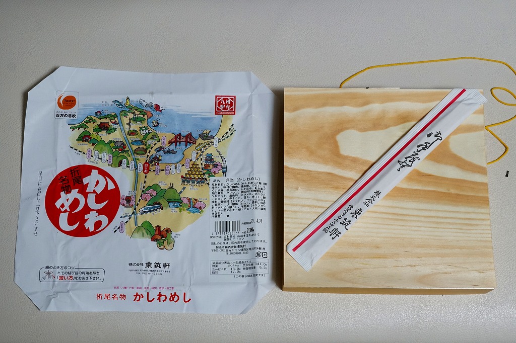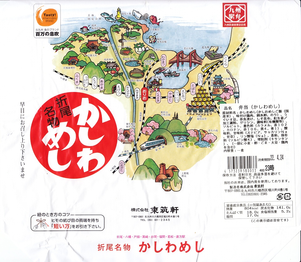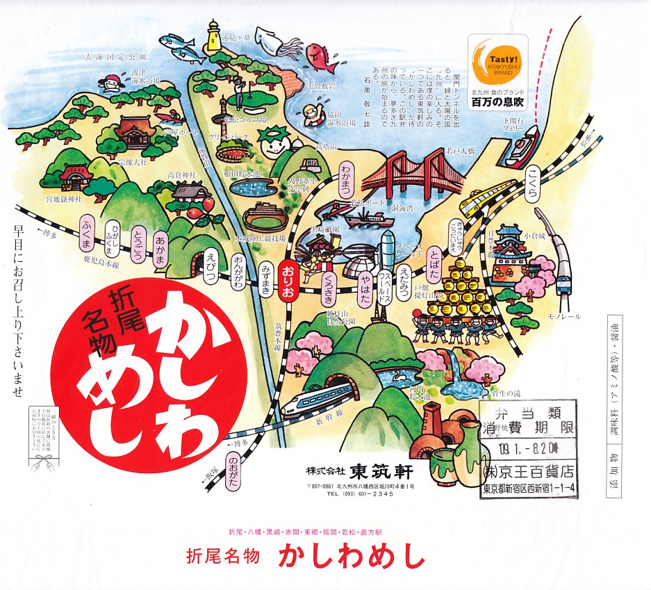2020(令和2)年1月15日に購入した、折尾駅弁の掛紙。その絵柄は基本的に20年以上変わらないが、イラストのアップデートはなされている。ここでは2018年1月閉園のスペースワールドが消え、小倉駅付近に2017年2月開場の北九州スタジアムが出現した。容器や中身や風味は変わらない。