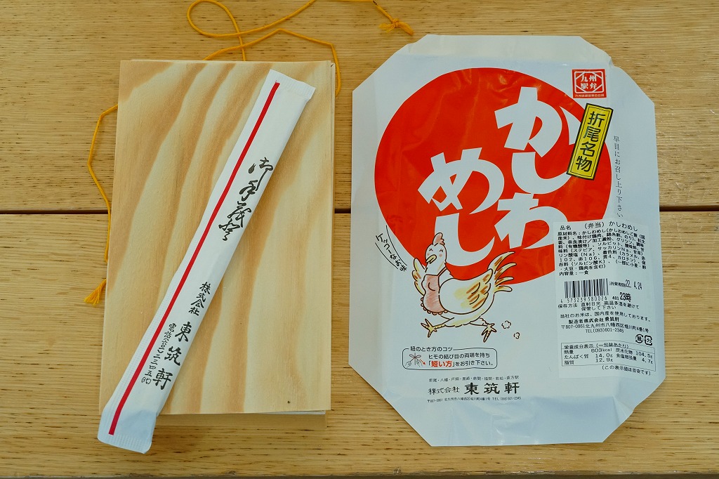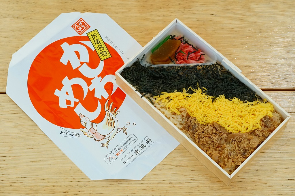 1921(大正10)年に発売。日本一の鶏飯駅弁とも評価される、折尾駅のかしわめし。昔ながらの経木の容器に、変わらぬデザインの掛紙をかけた中身は、鶏肉の炊き込み御飯の上に、刻み海苔と錦糸卵とフレーク状のかしわ(鶏)を載せた、九州北部を中心に山口県から鹿児島県まで駅弁で分布するかしわめし。秘伝の材料と製法で炊かれた御飯は口の中で甘く溶け、絶品と唸らせる味。2025年時点で年間約40万個のかしわめしが売れるという。