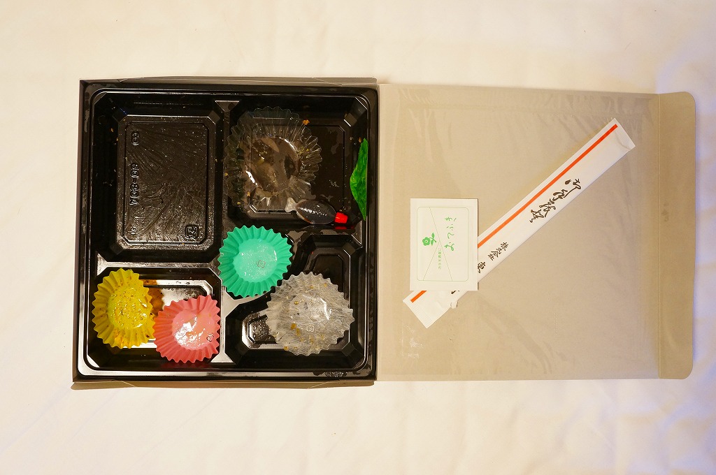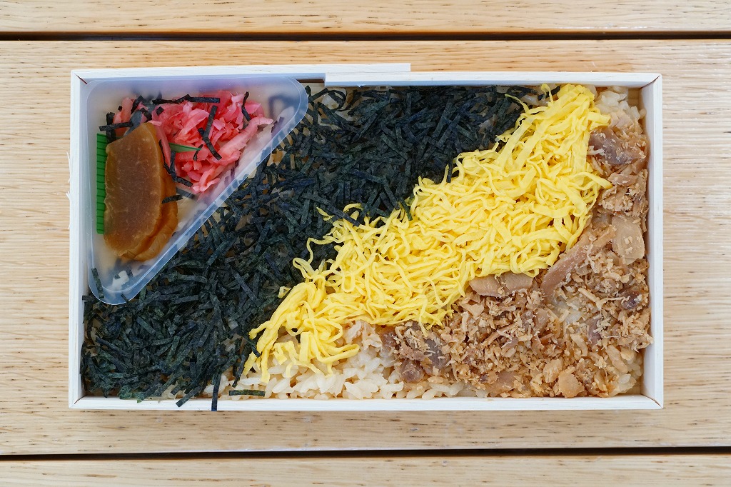 中身は他駅のコロナ禍対策冷凍駅弁とは違い、解凍か加熱でそのまま食べられるものではない。黒いプラ製トレーに薄く敷き詰めた鶏飯と、錦糸卵とかしわ肉と刻み海苔が、合計4袋に渡り個別に密封される。折り畳んだ掛紙の内面が「お召し上がり方」で、自然解凍か電子レンジ利用ののち、自分で盛り付ける手順が示される。