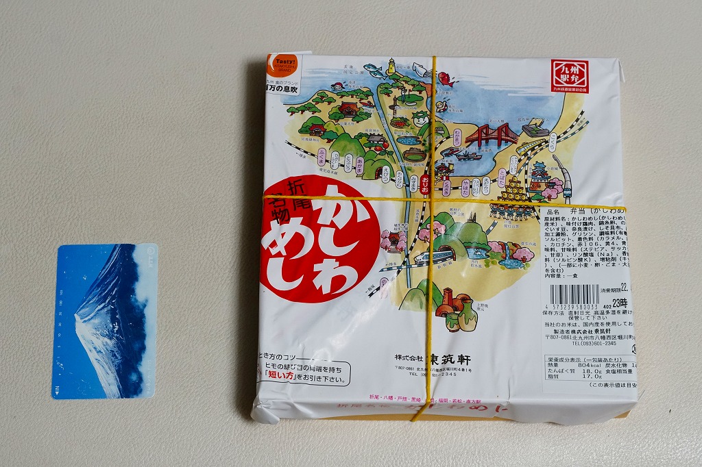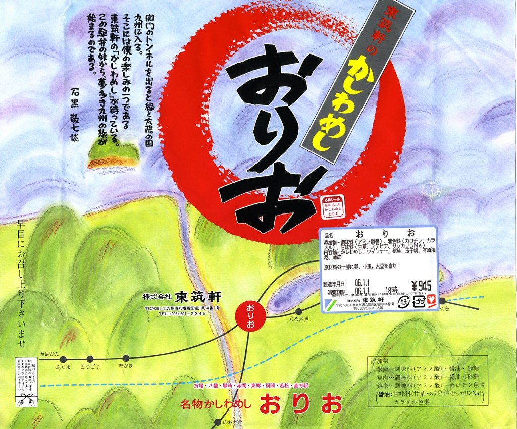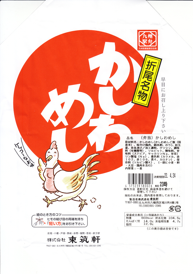 2009(平成21)年1月8日20時の調製である、折尾駅弁の掛紙。京王百貨店の駅弁大会で実演販売されたもので、価格はおそらく750円。下記の2002年のものと、北九州食のブランドのアイコンが増えたことと、販売駅から枝光がなくなったことしか違わない。京王百貨店駅弁大会には常に、折尾のかしわめしの販売要望が多く来ているそうだが、実際に来てみると見た目にほとんど売れず、また来なくなることを繰り返しているように見える。