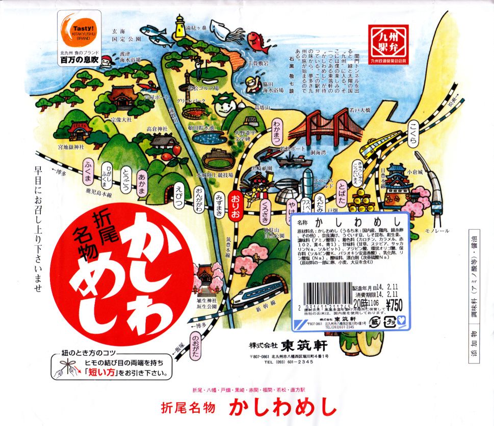 2014(平成26)年2月11日に購入した、折尾駅弁の掛紙。その絵柄はだいたい、下記の2009年のものや、上記の2020年のものと変わらない。「紐のとき方のコツ」が分かりやすくなり、小倉の港からフェリーが消え、九州駅弁マークと埴生神社と垣生公園が加わり、調製印が食品表示ラベルになり絵柄の一部が隠れた。中身も変わらない。