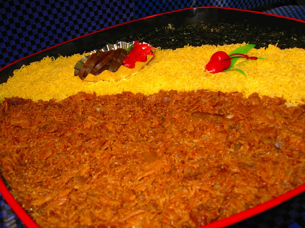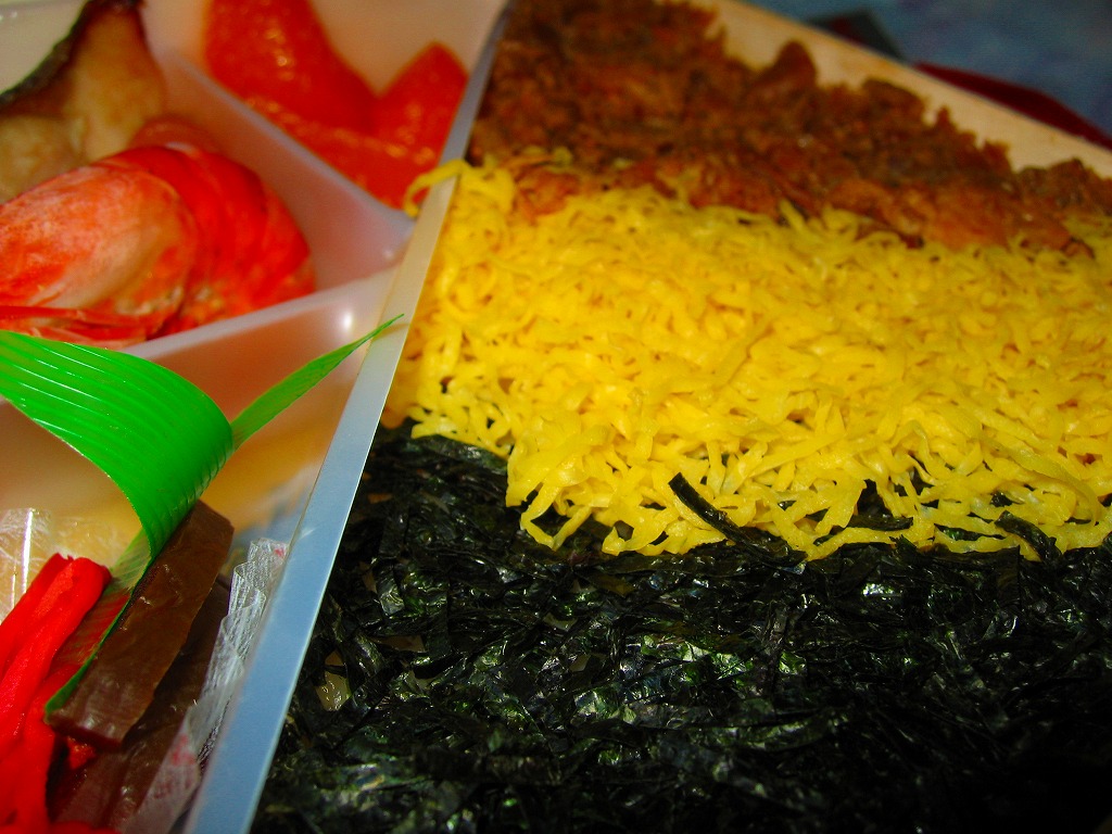 折尾駅弁「かしわめし」の巨大版。予約しなければ買えないが、調製元のチラシなどの商品案内にはその名前と存在が明記され、社内では「かもり」という略称まであるらしい。これは日本一大きな駅弁ではないかと思う。中身が約2,500グラム、総重量は約3キログラム。40.5センチ四方のプラ製容器に、大きな三色のストライプを描いてかしわめしを約3センチ厚でぎっしりと詰め、紅生姜ひとつまみとタクアン約7枚を添えて、2個のさくらんぼで彩る。透明なふたは各所をセロテープで留め、これに割りばし5膳、平皿5枚、ミニしゃもじ1本を付けて、ビニール袋に収納する。