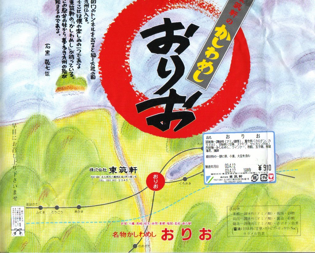 2003(平成15)年4月12日の調製である、折尾駅弁の掛紙。その絵柄は上記の2006年と、まったく同じ。値段は異なるが、中身も同じ。