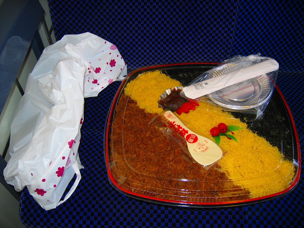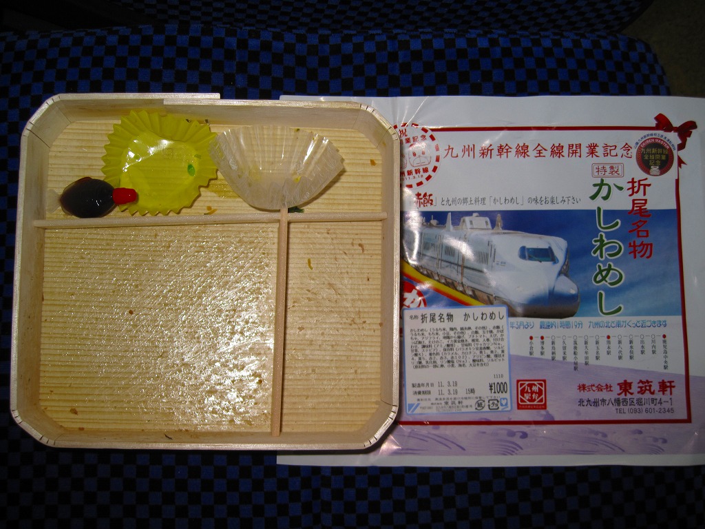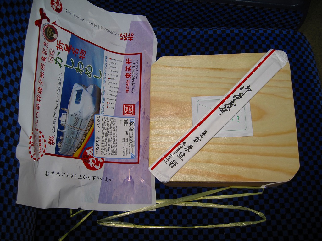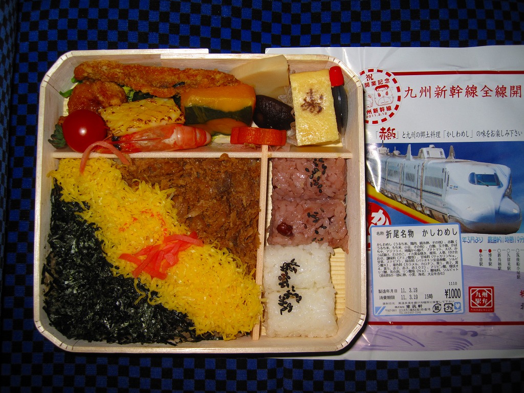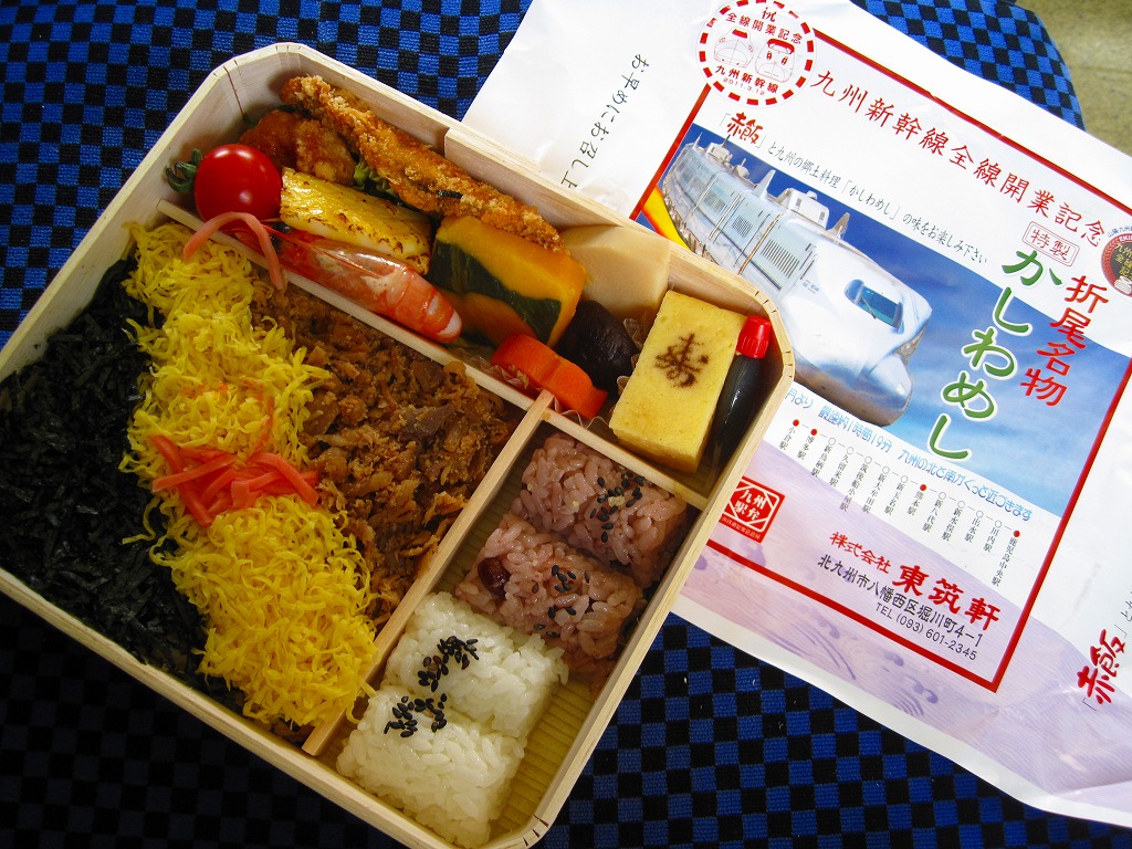 九州新幹線全線開業記念駅弁22種のひとつとして、2011(平成23)年1月1日から8月31日まで販売。平たく四角い木製容器に経木でふたをして、九州新幹線の車両の写真や停車駅に2種のロゴマークを印刷した掛紙で包む。中身はかしわめし、赤飯と白御飯の俵飯、アジフライ、「寿」の焼き印入りの玉子焼、鶏唐揚、プチトマト、イカ黄金焼、カボチャやシイタケなどの煮物など。揚げ物がちょっと小粒かなと思うくらいで、身が詰まり味も締まる、気持ちの良い旅の味。