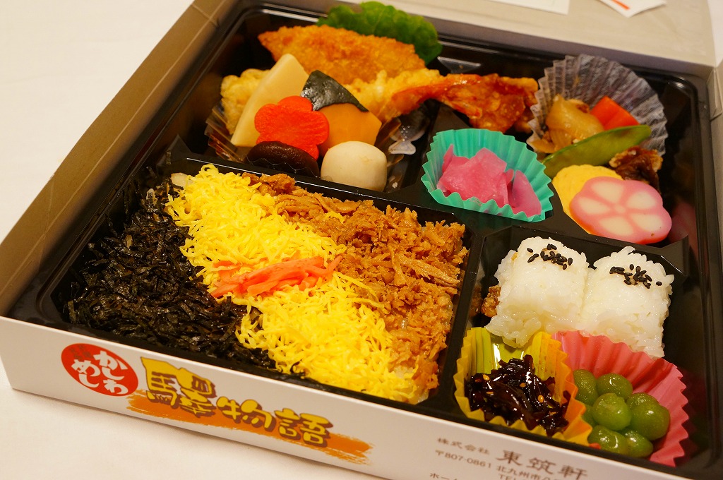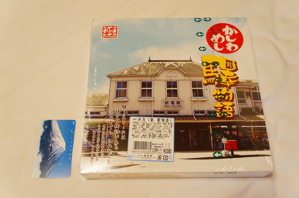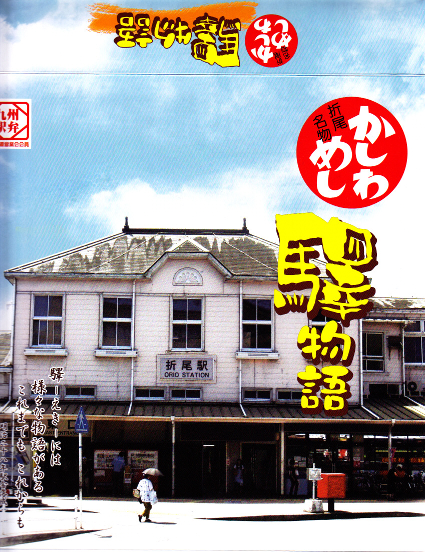 折尾駅の駅弁「驛物語」の、2014(平成26)年時点での姿。経木折に掛紙という、昔ながらの駅弁の姿を廃し、ボール紙容器を使うようになっていた。かしわめしと白飯、エビフライに鶏唐揚、ミートローフと煮物などという中身は、あまり変わっていない。価格は2014年2月の購入時で1,000円、同年4月の消費税率改定により1,030円、2020年時点で1,080円。2022年2月限りで終売のようで、3月から中身の似た要予約の新商品「折尾ものがたり」(1,100円)を発売。