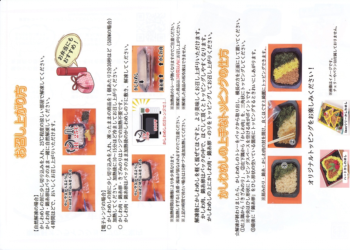 2021(令和3)年11月1日に調製元のオンラインショップで発売。ついに誕生した、全国で注文できる冷凍食品のかしわめし。発売は調製元のコロナ禍対策かもしれないが、折尾駅弁のかしわめしが誕生100周年を迎えた節目の年の発売であることがうたわれる。駅弁と同じ絵柄も取り入れた掛紙では、うどんとそばの冷凍販売を宣伝する。