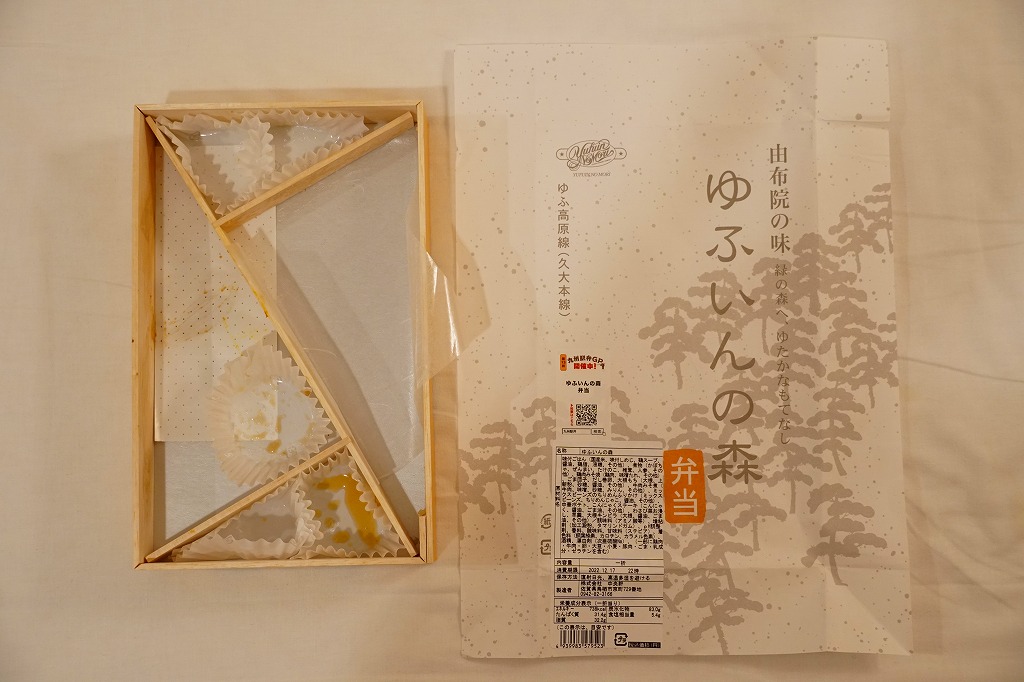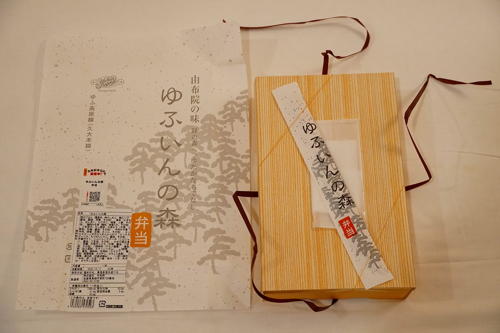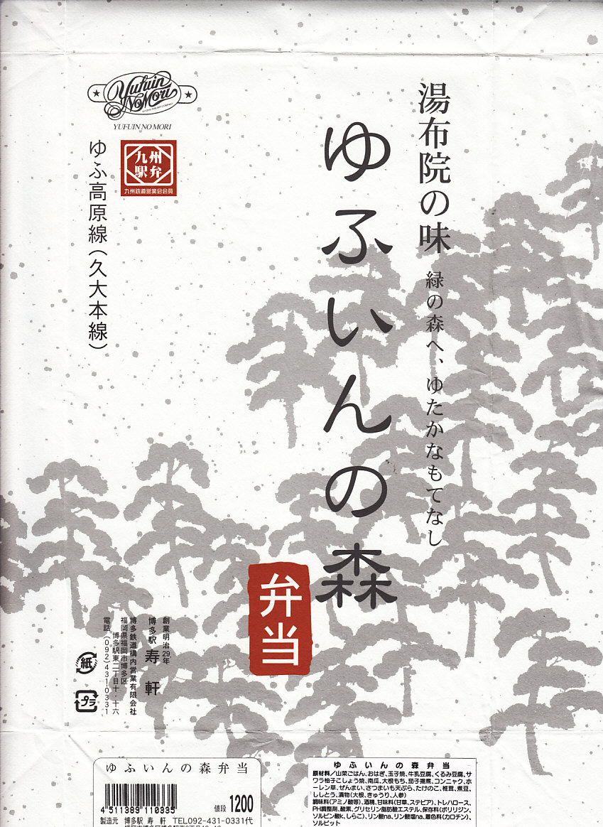 2001(平成13)年11月に特急「ゆふいんの森」車内で発売。当時のゆふいん料理研究会、特急「ゆふいんの森」車内で販売やサービスを担当する客室乗務員、久留米駅の駅弁屋の3者が共同で開発した、この観光列車のためのお弁当。当時の調製元が2003年12月に廃業したため博多駅の駅弁屋が引き継ぎ、その調製元も2010年12月に廃業したため終売、2011年10月までに鳥栖駅の駅弁屋が引き継いだ。中身を斜めに仕切った、大きな長方形の折箱を、松林と弁当名を描いた白い包装紙で包む姿は、発売時から変わらず受け継がれる。