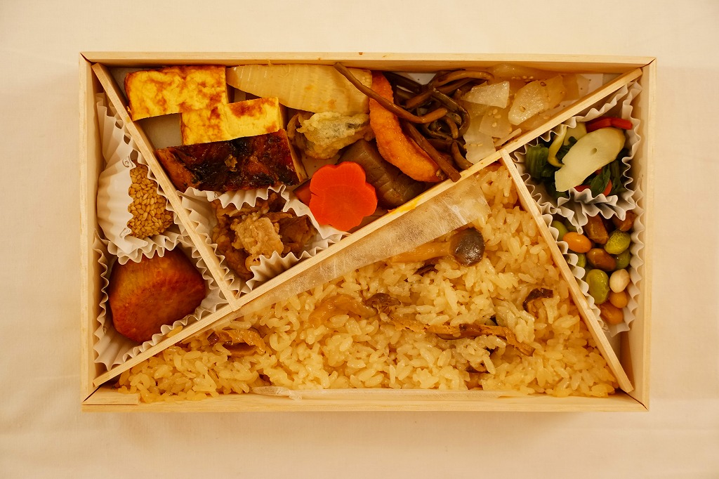 左右に開くギミックを持つ折箱を、和紙風プラの風呂敷で包む。掛紙はとくになく、調製元の名刺大のカードが付いていた。中身は下段に大きな鯛めしと小さなうすい豆御飯の俵飯がふたつずつと柴漬け、上段にお品書きの表現で鰻巻き、旬魚の西京焼、タコの桜煮、合鴨ロース煮、アサリとホウレンソウの煮浸し、酢取りミョウガ、季節野菜の炊き合わせ。一般的な駅弁の雰囲気とは違う、見た目も内容も上質な折詰。2021年までの販売か。