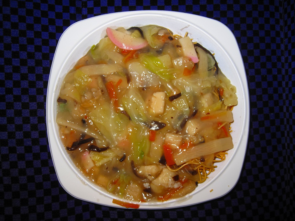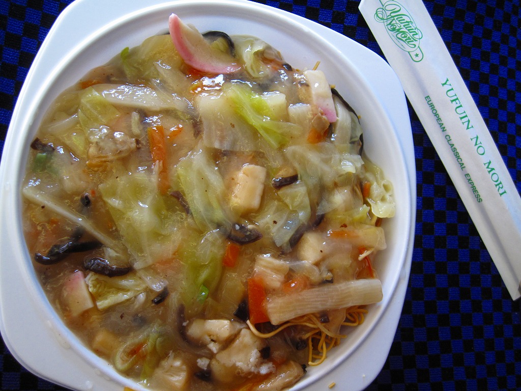 博多駅と由布院駅や大分駅を結ぶ特急列車「ゆふいんの森」のビュッフェで買えた車内調製品。白いプラ製トレーに乾麺を敷き、ハクサイやシイタケやイカやカマボコなどが混ざる電子レンジで加熱のレトルトあんかけをかけたもの。酸味を抑えた、さっぱりした味。