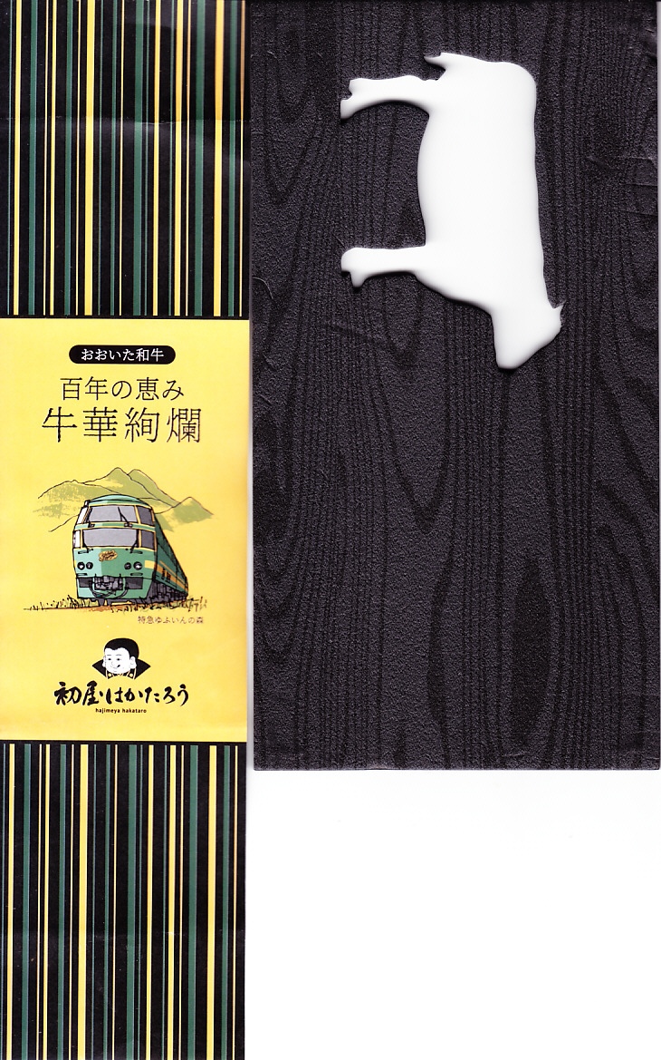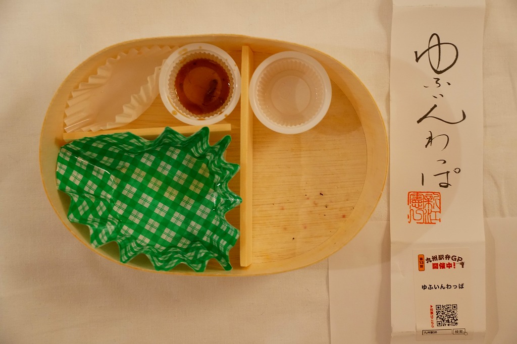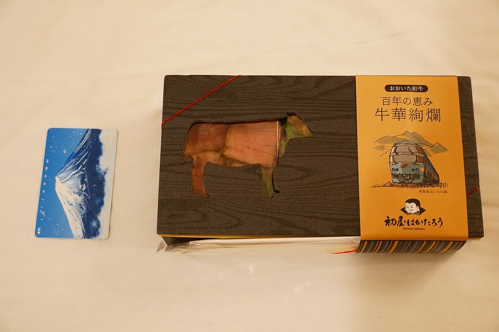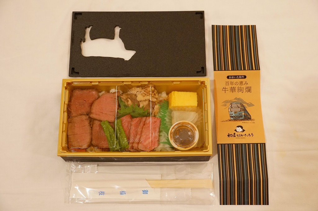 中身は白飯を、大分県のブランド牛「おおいた和牛」のローストビーフ3枚、薄切れ肉、厚切り肉3枚の3種類で覆い、ししとう、焼肉のたれ、玉子焼、甘酢大根を添えるもの。きめの細かい赤身と豊かなサシを持つ牛肉の三様に溜め息が出る。焼肉のたれも特製だろうが、タレがないほうが肉の香りを楽しめると思った。値段にも溜め息。調製元は福岡の飲食店コンサルタントだろうか、JR九州のプレスリリースでは、博多駅や福岡空港にて九州の美味しい食を発信し続けている会社と紹介された。