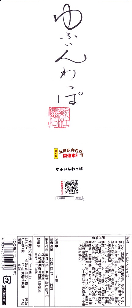 2006(平成18)年1月1日に購入した、車内弁当の包装紙。その絵柄は、上記の2010年のものと変わらない。JR九州の駅弁キャンペーン「第2弾、「九州の駅弁」ランキング!」でのみ実施されたシールラリーの応募シールが貼られていた。