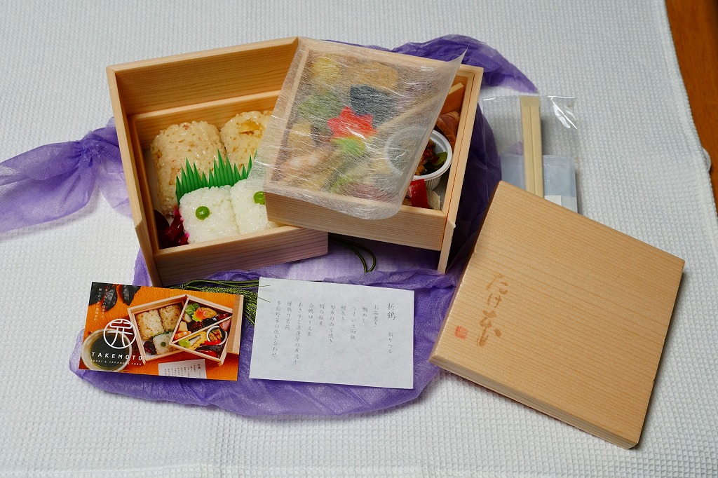 2017(平成29)年10月から12月まで、特急列車「ゆふいんの森91・92号」の車内で一日30個を販売。福岡県小倉の寿司店「竹本」の監修と考案による車内限定弁当。同年7月の九州北部豪雨により福岡県日田市内で久大本線の橋梁が流失し、博多駅と由布院駅を結ぶ特急「ゆふいんの森」の経路が久留米駅経由から小倉駅経由に変わったため、北九州地区の名店の味で弁当を制作したという。線路の復旧後も販売は継続された。今回は京王百貨店の駅弁大会で輸送販売されたもの。