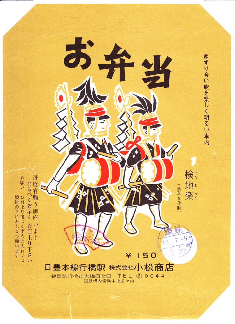1960年代の、10月7日6時の調製と思われる、昔の行橋駅弁の掛紙。検地楽(けんじがく)と書かれる、行橋市の下検地地区に伝わる太鼓踊りの光景を描く。