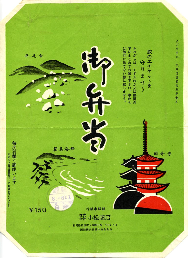 昭和40年代の、8月8日11時の調製と思われる、昔の行橋駅弁の掛紙。現在の行橋はベッドタウンであり工業都市であるが、当時は掛紙に平尾台、簑島海岸、国分寺といった名勝旧跡を描くような土地であったのだろう。