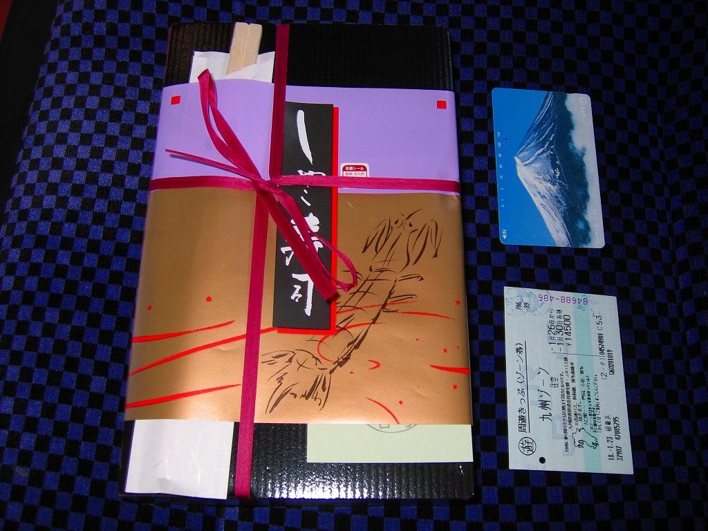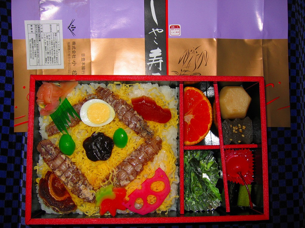 1990(平成2)年の福岡国体に合わせて発売。赤い発泡材を黒塗りした、一見高級感のある容器を使う。中身は正方形の御飯の上に錦糸卵その他とともに菱形に配置したしゃこを載せ、残る部分に付合せと、季節毎に変えるというデザートを詰めたもの。味は見た目の範囲で品質の良さが出ており、メインのしゃこの見栄えや風味は良好。