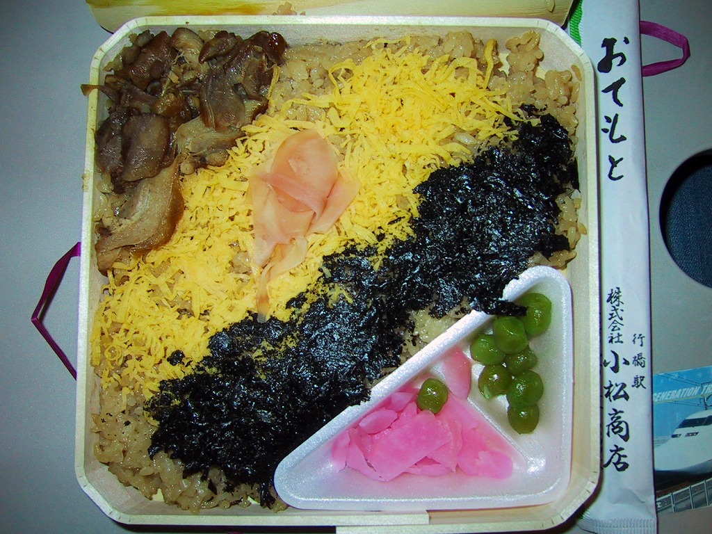 行橋駅の幕の内弁当。長方形の経木折を大きな掛紙で包む。中身は細長い俵飯の日の丸御飯に、白いトレーに詰めた白身魚フライや焼鮭や厚焼卵や芋天ぷらや鶏唐揚などのおかず。行橋はおよそ観光要素のない、工業とベッドタウンの都市。それなのに駅弁の美味さには定評があり、駅弁ファンがわざわざ寄り道して駅弁を買いに来るのだとか。駅の高架化後は、改札を出てすぐの売店で購入できた。