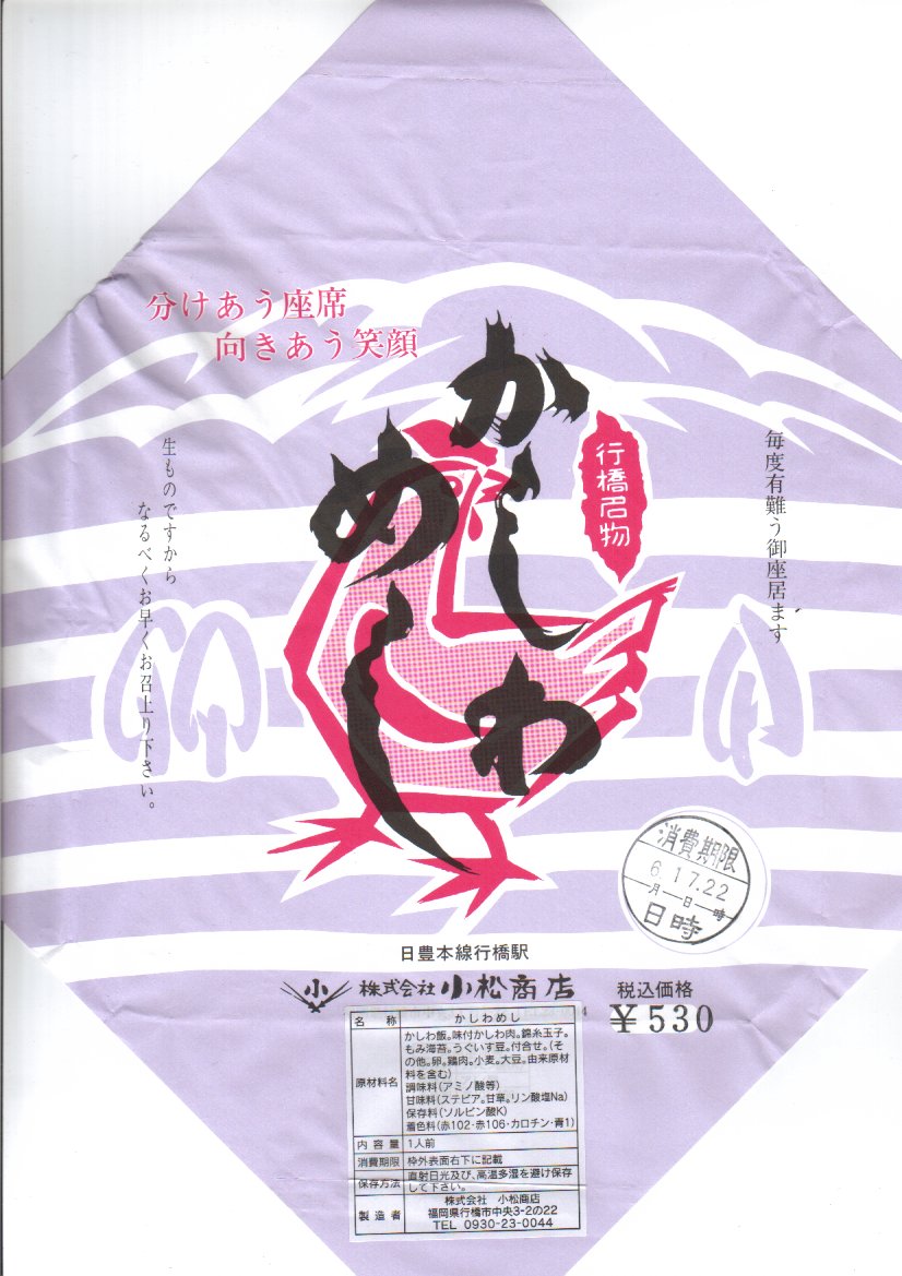 昭和時代から長らく売られた、行橋駅のかしわめし。中身は鶏飯を鶏肉と錦糸卵と刻み海苔で覆い、うぐいす豆と大根漬を添えるもので、つまりかしわめし。御飯の色が濃いことと、かしわ(鶏肉)がフレーク状というには大きめであることが特徴。比較的廉価で提供されるかしわめし駅弁の中でもこの価格は安く、経木折と古風な掛紙、そしてシールではなくスタンプを使った消費期限日時表示が懐かしい。予約制の1,050円バージョンもあるらしい。価格は2002年の購入時で530円、2006年4月1日から550円。