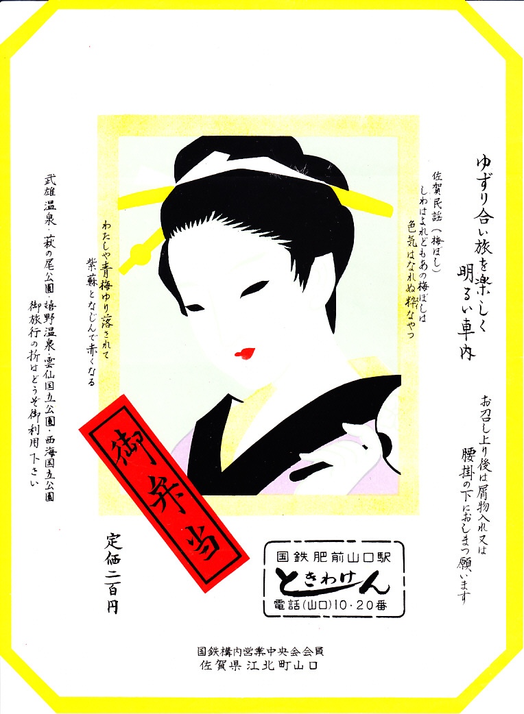 価格から1970年代前半のものと思われる、昔の肥前山口駅、現在の江北駅の駅弁の掛紙。「しわはよれどもあの梅ぼしは 色気はなれぬ粋なやつ わたしや青梅ゆり落されて 紫蘇となじんで赤くなる」という、かつて佐賀の花柳界で歌われた民謡を記し、そのイメージで女性を描いたのだろう。