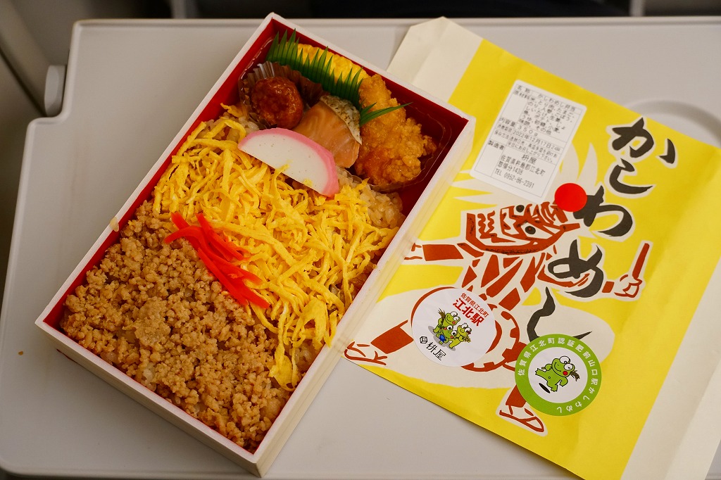 肥前山口駅は、長崎本線が佐世保線を分ける駅。かつてはこの駅で、長崎方面と佐世保方面の列車の分割や併合がよく行われ、そのための数分から十数分の停車時間があった。だから駅弁がよく売れたのではないかと想像できるが、そんな賑わいを記録した文章や写真を見たことがなく、特急列車「かもめ」「みどり」や寝台特急列車「さくら」の分割併合があった頃には駅弁が消えていたので、そうでもなかったらしい。