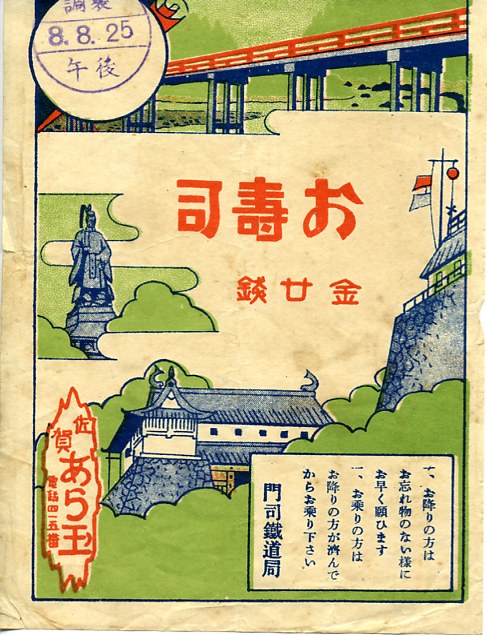1933(昭和8)年8月25日午後の調製と思われる、昔の佐賀駅弁の掛紙。あるいは1919(大正8)年のものか。駅弁の名前にも駅弁屋の屋号にもひらがなが使われており、戦前では少数派ではないか。どこかの橋、1913(大正2)年に松原神社に建てられて1944(昭和19)年に金属類回収令で供出された鍋島直正公銅像、佐賀城の鯱の門(しゃちのもん)や石垣を描いたようにみえる。
